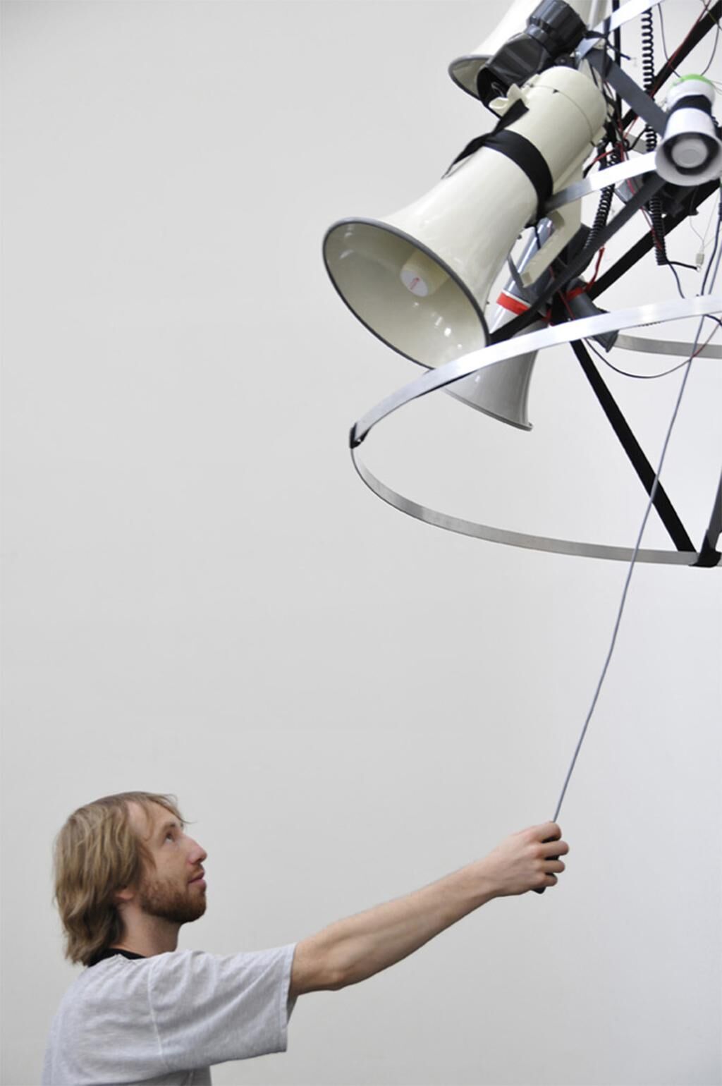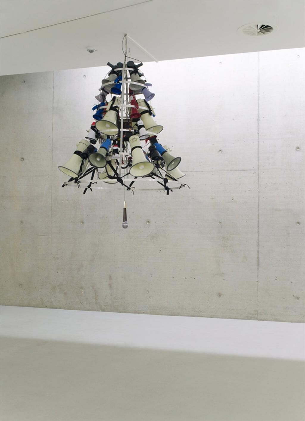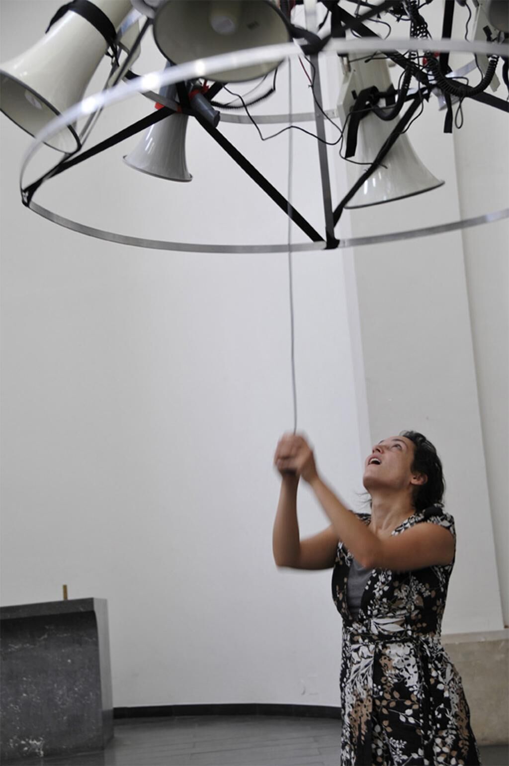 40 megaphones of different sizes and capacities are fixed to an aluminum grid made in the shape of a bell. All audio inputs are grouped together and connected to one single microphone. The microphone is hanging in the center of the bell just below the megaphones. Only a temporary de-energized system prevents the inevitable audio feedback. As soon as the visitors disturb the microphone from its suspended state, the audio system automatically starts up and the deafening roar of a 40-megaphone chorus of amplified feedback collapses on the bell-ringer. The alarm doesn’t proclaim any impending catastrophe, it only generates its own temporary catastrophe.