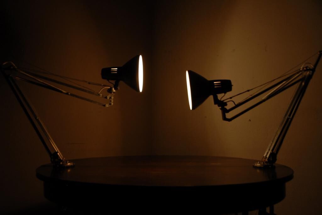 ""Monolog Of Two Machines"" is a kinetic installation of two lamps having a dialog. The mechanic arms are moved by servos via steel strings, so they gain a kind of gesture. As soon as someone gets close to the system, both lamps focus the intruder until a certain distance is restored. The associative connection of the mechanical dynamics to the own repertoire of gestures enables the recipient to decode the movement and creates a contour of life.
