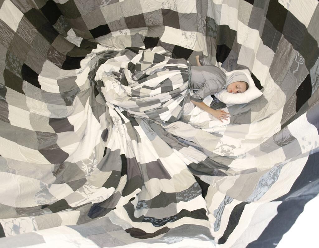Raumkleid. Textile Rauminstallation. Ein Kleid aus 52 qm Stoff bildet einen Raum. Aktiv wird das Kleid immer wieder von der Künstlerin als auch von freiwilligen Probanden getragen, die sich im geschlossenen Raumkleid bewegen oder sich auf das vorhandene Kissen zur Ruhe legen. Über an der Decke angebrachte Spiegel und transparente Stoffelemente ist von außen Einsicht möglich.