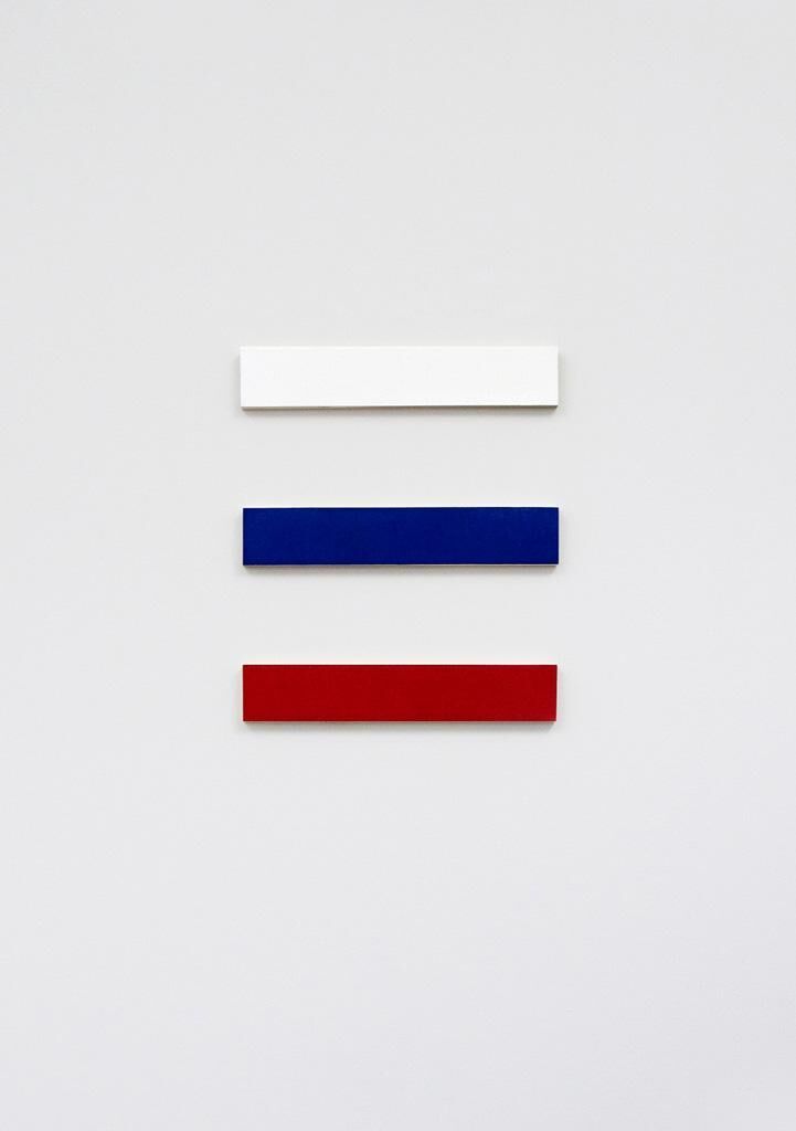 At first sight one might think of these three varnished pieces of wood as a reminiscence of minimal art. But the title makes clear that it‘s a visualization of three more or less sociological terms for class affiliation: the English terms White Collar for office employees and Blue Collar for craftsmen and workers as well as the American English expression Red Neck for (reactionistic) farmers. The size of the wood pieces is orientated on the size of a shirt‘s collar as the colour or even the missing of this collar was used as an indicator for social status.