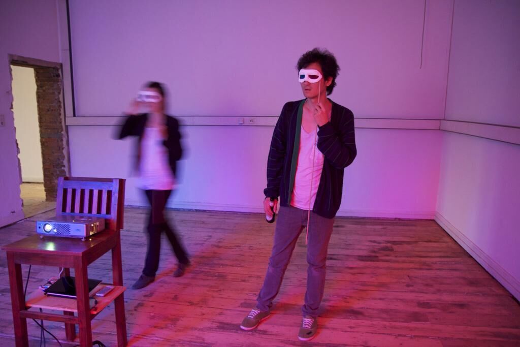 ´expanded view´ is an experimental 3D video installation recorded with stereoscopic digital camera and two microphones. The red-cyan masks are molded from the face of the artist. They are used to view the 3D video. The windows of the exhibition space are covered with red cyan film. Stereoscopic 3D video projection in the middle of the windows is recorded on a central street in the city of Wuppertal. The camera (artist’s perspective) is static and placed in the middle of the street. Passers-by walk around the camera. Created as part of the KHM seminar 'living Avatar’ with Professors Hörner/Antlfinger.'