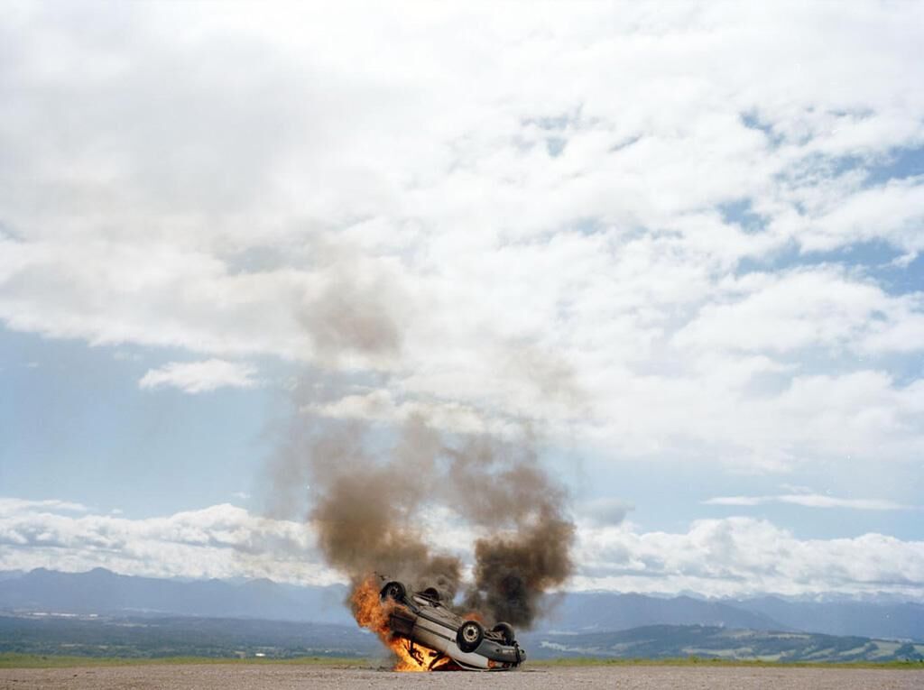 A car is burning in front of the Alps. The car swallows its own smoke and disappears afterwards. The expectation of the perception and the space gets inverted.