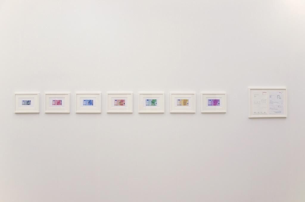 Die Fotoarbeit „885 €“ setzt Bildgegenstand, Produktionskosten und Verkaufswert in Bezug und bildet Eurobanknoten im Wert von 885 Euro ab – jenen Betrag, der, wie zwei Originalquittungen belegen, für die Rahmen der sieben gezeigten Fotografien aufgewendet wurde. Der Verkaufspreis beträgt wiederum 885 Euro, womit das Ganze sich als Nullsummenspiel herausstellt. Darüber hinaus soll ein inflationärer Gedanke über das Kunstwerk an sich entstehen. Mehr Kunst = weniger Wert.