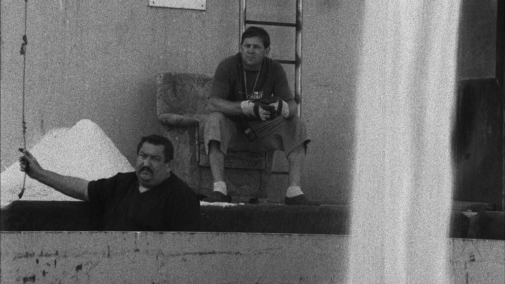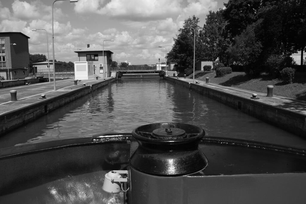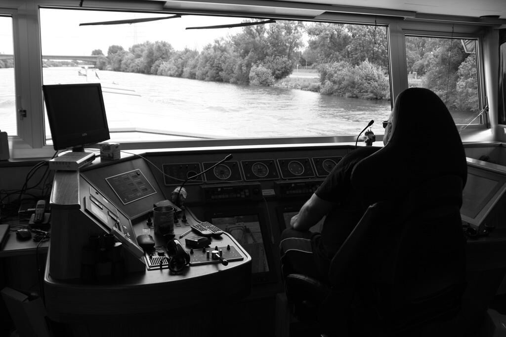 We see blackness: A huge hole opens up in front of us. We see whiteness: Slowly, it fills up with salt. We find ourselves on a river barge and sail down the Rhine. The landscape changes, but we hardly become aware of it. Reality exclusively takes place on board. We see light and shadows creeping over the deck, we hear engines rumbling under it. The immediacy of heaviness and labor on board and the unreal ease of the seen let us swim.