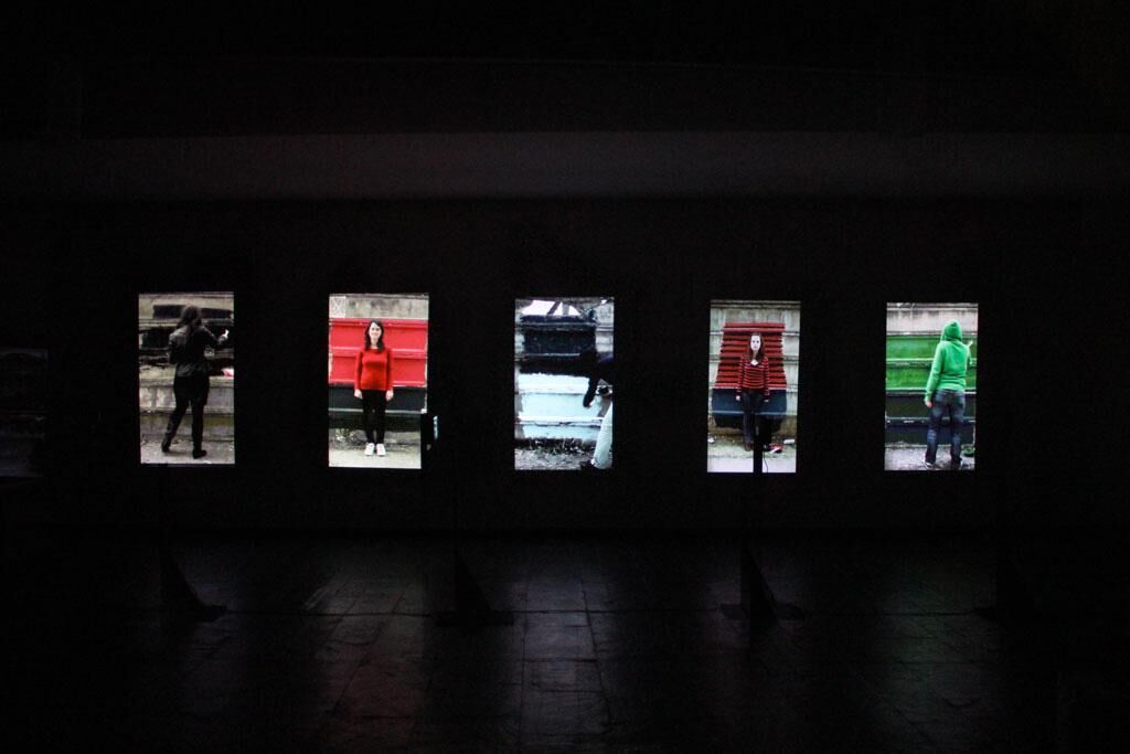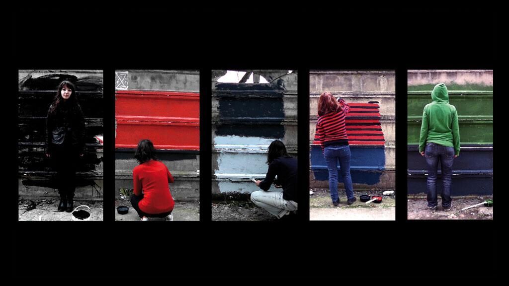 Conquering the environment. Five girls from Cluj-Napoca, Romania, change their environment. The concrete walls used as backgrounds for the paintings were built during the times of the Socialist Republic of Romania and are still characteristic for parts of the city Cluj-Napoca. Each participant gets paint and brush suitable to their clothes. The environment is painted in the colours of their own clothes. The process is recorded by a video camera. The result is a series of individual portraits and actions: Every person in front of the camera shows their personality in the way he/she is painting and acting. We are always influenced by our environment, by our culture and family background but we are also free to take our own choices. In each moment we can decide which way to go and how we want to change the conditions of the world we live in.