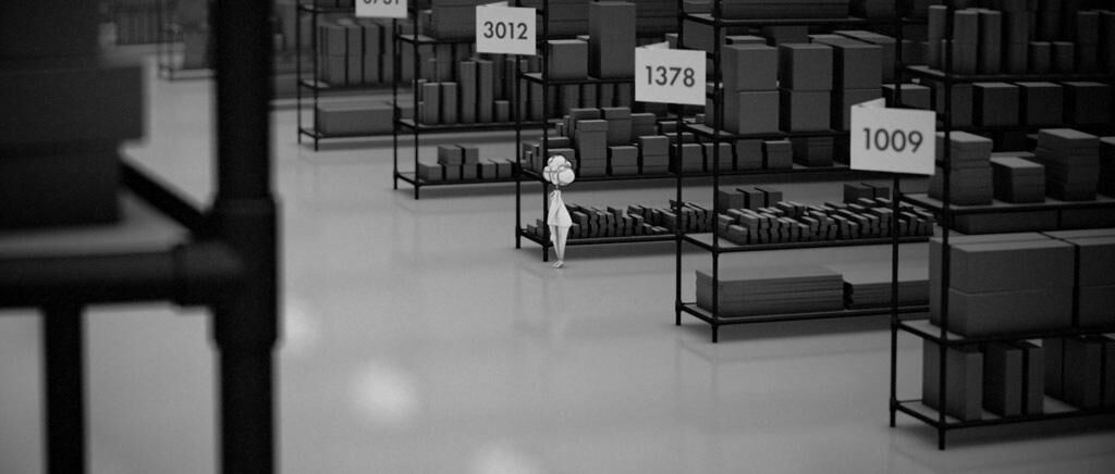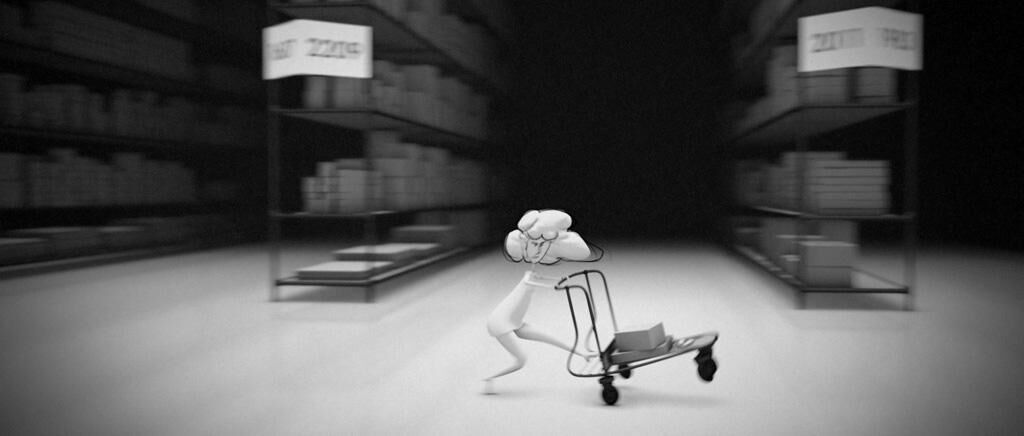 A huge department store. The mother of little Jacob seems to be the last customer. She is lost in a maze of corridors and opaque numbered store shelves. By loudspeaker announcement, customers are asked to complete their purchases and pick up the remaining children at the Kiddy Corral. While the Mother is desperately searching for the Kiddy Corral, the initially patient announcement voice is becoming more and more sharp and incites her in a fast-paced odyssey through the store. Using a shopping cart, she accelerates her search, led by a promising, distant rocking horse. Ultimately, her hopes are shattered: the labyrinthine corridors end in an oversized rocking horse department. Then the lights go out.