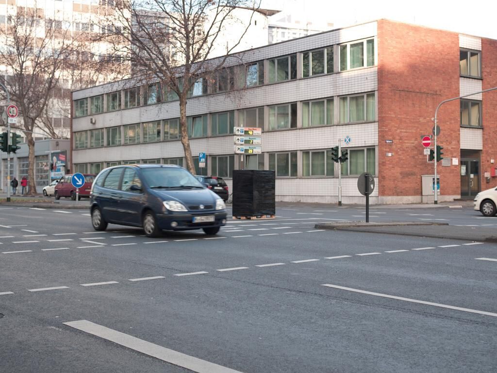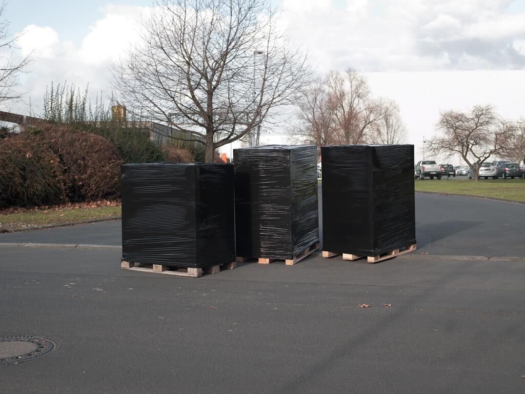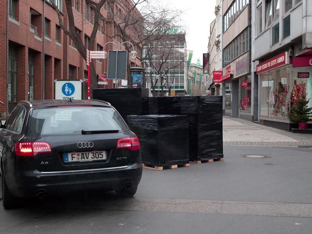 In schwarzer Folie verpackte Ladungen stehen mitten auf Kreuzungen. Autos fahren unbeeindruckt um sie herum.