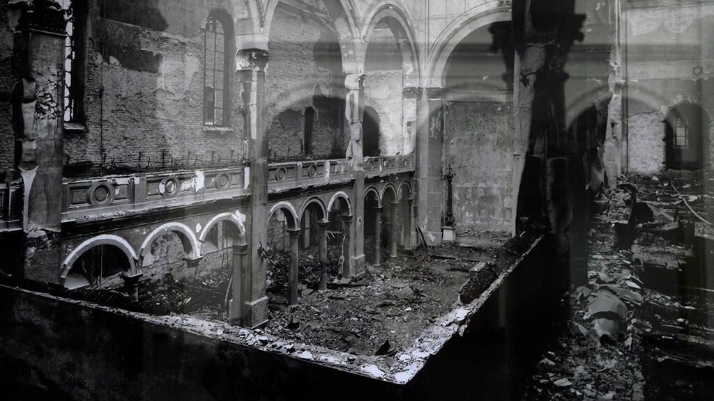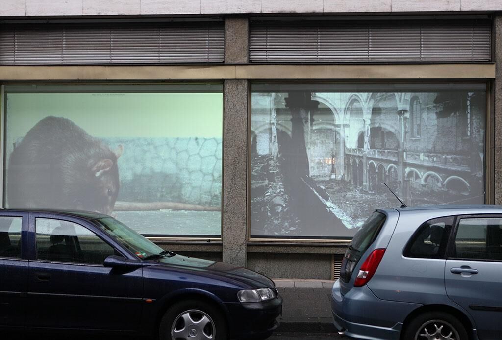 2-Kanal-Projektion auf die Schaufenster des Transmedialen Raumes. Das Video der Ratte wird live aus der Trinitatiskirche gestreamt. Die Schwarz-Weiß-Aufnahme daneben zeigt den zerstörten Innenraum der Trinitatiskirche 1942. Größenverhältnisse werden umgekehrt. Die Ratte, allgegenwärtig, doch meist versteckt in der Stadt, wird nun riesenhaft sichtbar. Ist sie dadurch bedrohlicher? Und was macht sie in der Kirche? Eine arme Kirchenmaus im meist für die Präsentation des Schönen reservierten Schaufenster?
