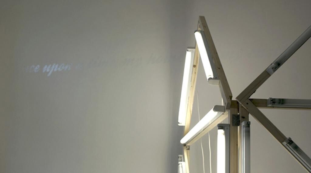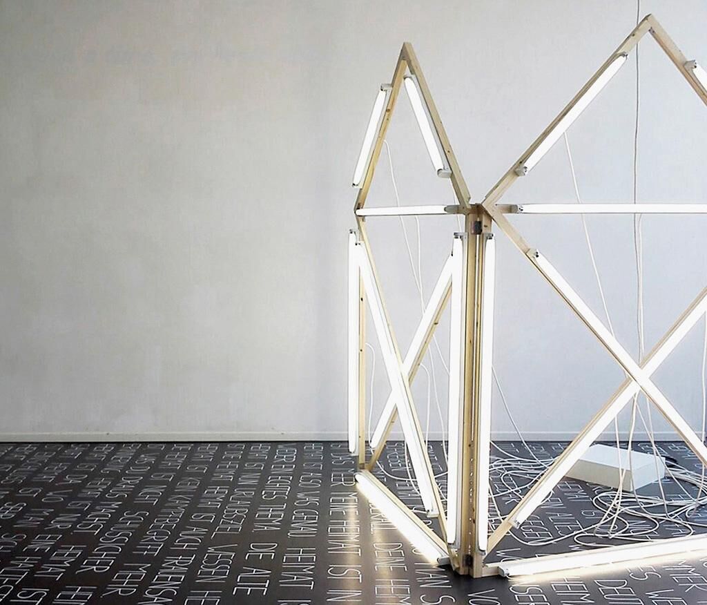 ""Once upon a time, my home was my castle"" refers to both the beginning of a fairy tale and the well-known proverb. The illuminated abstraction of a house draws on the “Nikolaus Problem”, where a person usually a child, has to draw the Nikolaus puzzle without lifting the pencil off the paper or going along the same line twice. As the house is drawn, the rhyme “Das ist das Haus vom Nikolaus” (""this is the house of Nicholas”) is chanted at a rate of one stroke per syllable. This installation deals with the emotional security one may have experienced in childhood connected to the specific place, the home. The Handwriting consists of a collection of Google results based on the search “Heimat ist...” (""home is...""). The results are as numerous as they are eclectic and indicate the problem of how to define the German term “Heimat”