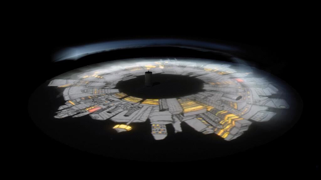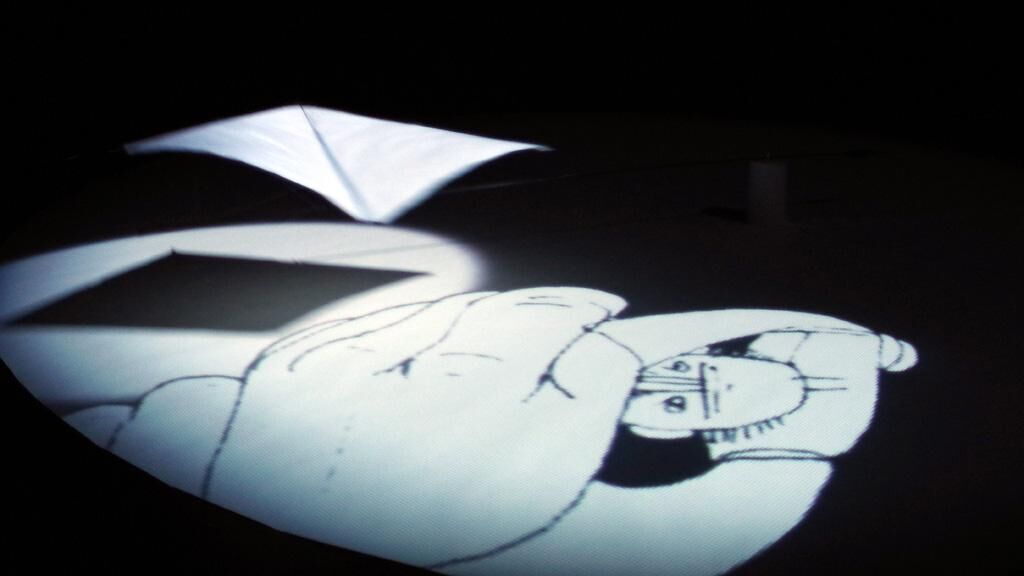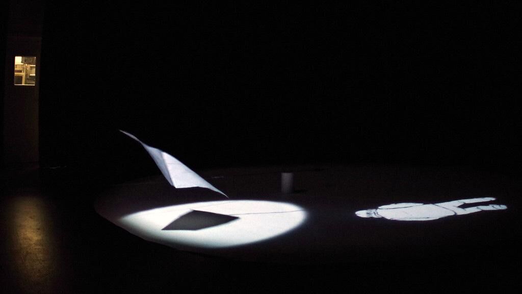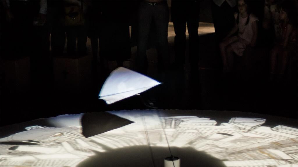 ""Long Way Home"" is a kinetic narration and spatial experience, in which a kite moving along in a circular path is used in a projected environment. The loop structure of the story, the kite in its clockwise movement, and the repetition of events all emphasize the circular structure of time. The hand-drawn animation shows an old man walking with a kite. After losing hold of the kite line he makes several attempts to reach it before he finally manages to hang on to the kite. It pulls him up into the sky, while an animated city appears below him. Night falls, and the city’s windows and billboards light up until the city vanishes under a mist of smoke. The old man slowly descends, touching down safely – and holding on to the line of the kite, starting again from the beginning in a never-ending cycle. Sounds are used to illustrate the surroundings and create an atmosphe- re that underscores the storyline.