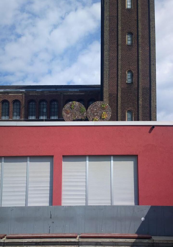 The only organic vegetation in KHM campus’ main courtyard where the students mostly gather and socialize is on the rooftop of one the buildings. This wild plantation is beautiful, invisible and inaccessible. I installed two oval mirrors on the roof, facing down, to reflect the ‘garden’ up for my fellow students. At the first encounter, the mirrors themselves are also almost hidden and need to be recognized. The garden on the roof is a fast changing ecosystem and reflects a natural process, yet in my view, its (reflected) image remains an alien simulation in the school for media arts.