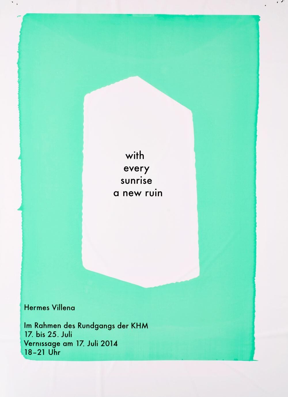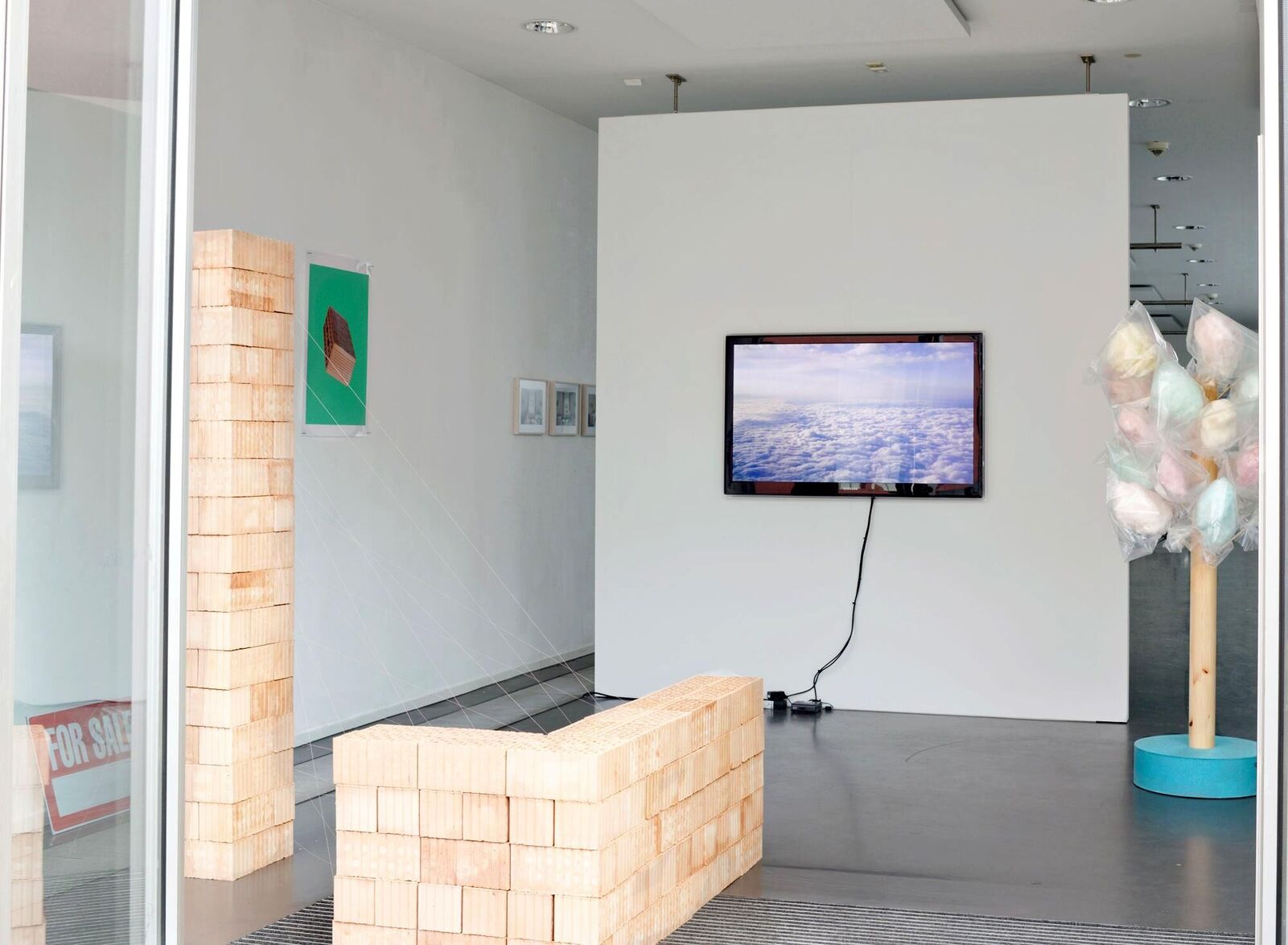 „Does the future have a future? This question looms over Hermes Villena's exhibition ""With Every Sunrise A New Ruin"" at the KHM foyer like one of the clouds in his untitled video (2014). The exhibition consists of a lower installation of bricks which is assumed to be a wall and attached to a higher construction behind it (of bricks as well) through pink threads, a video of placid clouds which turn out after a long 10-minute journey to be made of a completely different substance, a dream feeding a dream, and a sculpture of a wooden stand which serves as a support for small clouds of sugar candy for sale and that comes in all the colours of the rainbow. A sign ""For Sale"" leans matter of factly on a wall as if forgotten... Things and instances as different in terms of material and consistence and so in opposition to each other as two things can be: bricks and clouds, one being the very representation of materia, a concrete cell, the other immaterial, a phenomenon. It doesn't seem to be a coincidence that in his installation bricks take such a preponderous instance; still dealing with the consequences of a crisis of iceberg configurations that shattered the basis of one of men's most common dreams, that of one own's house, clouds as representation of chimera are of utter pertinence here."" - Lourdes Alva-