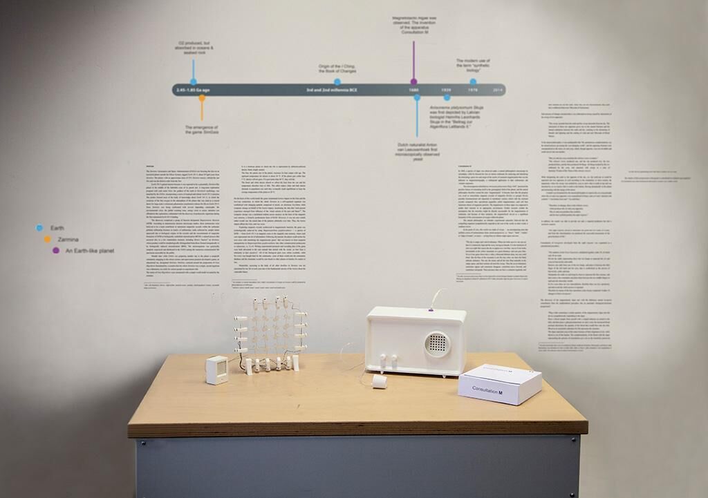Das Projekt „Consultation“ fokussiert sich auf die Umweltpolitik und die Beziehung der Menschheit zur Natur unter Herausforderungen der Synthetischen Biologie. Mit Designfiktionen stellt das Project eine alternative Welt vor, wo die Synthetische Biologie aus dem Labor hinaus zieht. Zwei spekulative Geräte ‒ „Consultaion M” und „SimGaia” ‒ bilden den Kern des Projektes; um jedes wurde eine kurze Geschichte entwickelt. Die Narrativen, welche unter Anlehnung an die Erdgeschichte chronologisch verbunden sind, bieten einen Einblick in die Welt. Damit lädt das Projekt „Consultation“ das Publikum ein, sich potentielle Konsequenzen der Synthetischen Biologie über einen viel längeren Zeitraum vorzustellen.