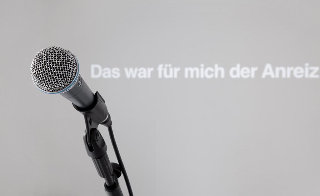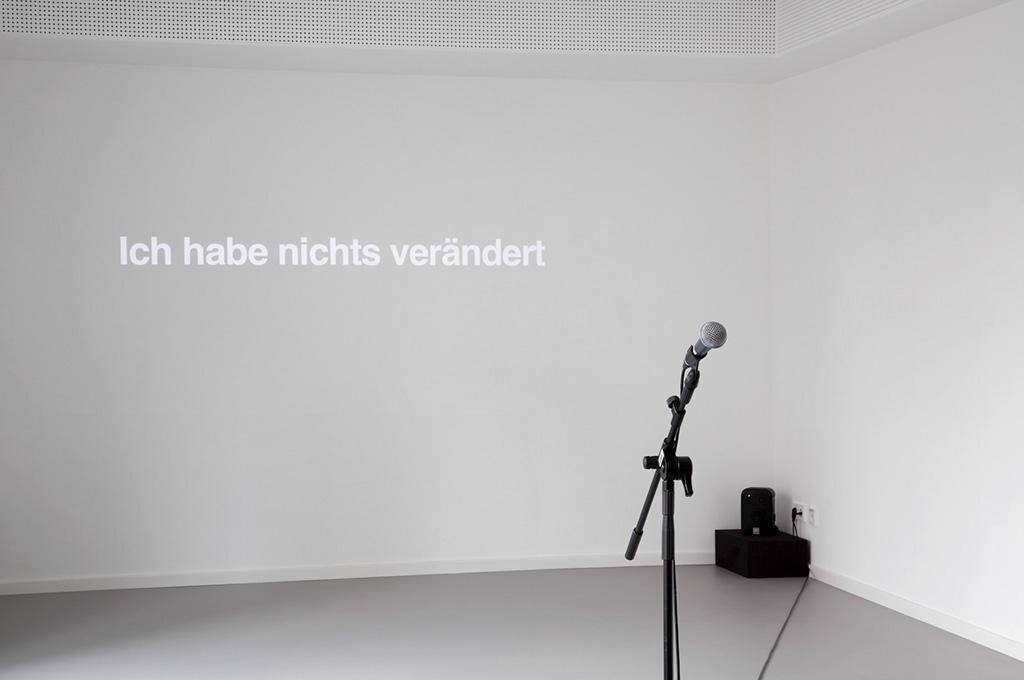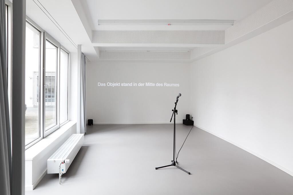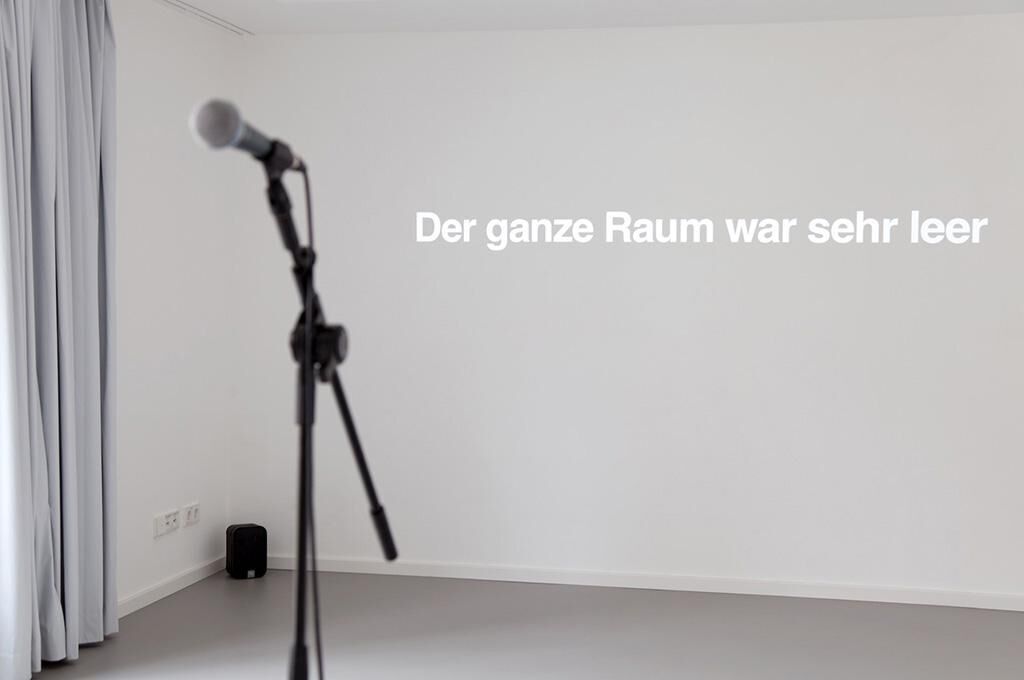 siebzehn war die 17. Ausstellung im CASE – Projektraum für Fotografie. Die Arbeit beschäftigt sich mit dem Ausstellen an sich, dem konkreten Ausstellungsraum und mit im CASE bisher stattgefundenen Ausstellungen anderer Künstler. In der Mitte des Raumes ist ein Mikrofon positioniert. Es lässt den potenziellen Redner in Richtung der hinteren Wand blicken, auf der sich im Minutentakt 40 verschiedene Sätze abwechseln. Es handelt sich um Zitate und Auszüge von Interviews mit vorherigen CASE-Ausstellern, in denen sie über ihre Arbeit berichten. Das Mikrofon ist ein Angebot für den Besucher meiner Ausstellung, Beschreibungen anderer Arbeiten im neu bespielten Raum laut vorzulesen oder eigene Formulierungen, Empfindungen oder Bemerkungen auszusprechen. Die mikrofon-verstärkte Stimme des Besuchers füllt den Ausstellungsraum. Das Sprechen über Kunst wird thematisiert, die Autorschaft eines Kunstwerkes verliert Kontur, wenn die zu lesenden Sätze nicht vom Künstler selbst, sondern vom Betrachter laut ausgesprochen werden.