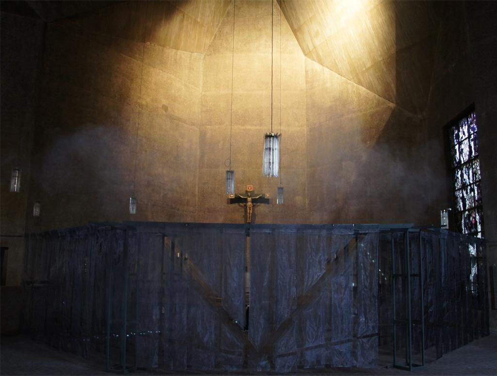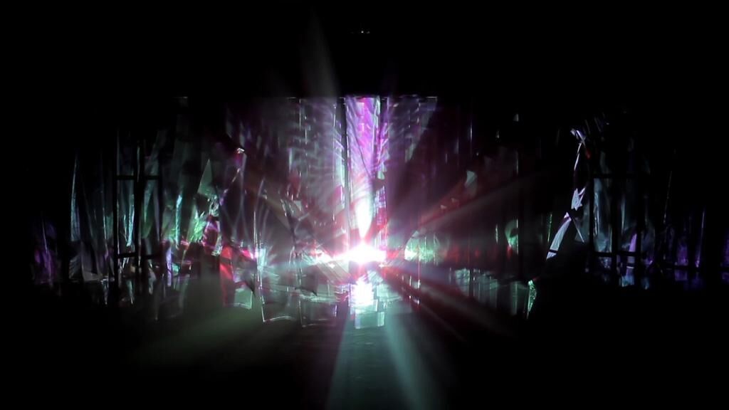 Inner mind architecture is a space live installation that uses video, multilayered structured screens, light, haze, sound fields and a wind machine. This virtual architecture installation was made and presented in St. Gertrud Church in Cologne December 2013 (built by architect Gottfreid Böhm in 1965) / updated March 2015 at the Arsenale in Venezia. The performance has three main parts with different sound fields. The first part of the live installation consists only of a light sculpture made of light and fog coming out from the gap in between the multilayered structured cut screens. The second part is a mix of both a light sculpture and video projection on multilayered structured screens. The last part is directed into deep space by using the wind coming out of large electric fans on multilayered structured screens. The balance of the wind velocity is controlled with a special programmed software. Sound: The audience can enjoy the special sound experience in this architecture form. All the sound systems are turned to the ceiling in the Böhm architecture creating a very special atmosphere at this venue. I created the new virtual space in Böhm architecture that uses six elements: light, haze, video projection, multilayered screens, wind and sound field. In other words, ""Inner Mind Architecture"" is a virtual architecture with a time axis. And it is an amplifier of the mind, using six elements in the church. I call a category of the artwork the expanded generative architecture.