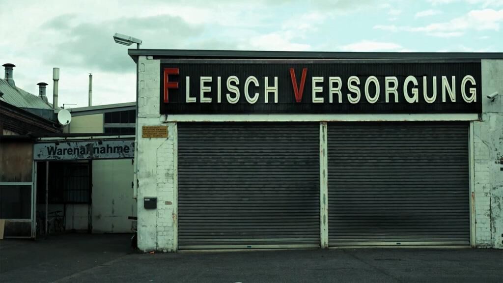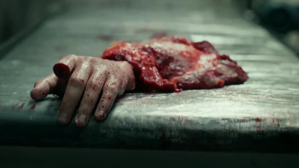 Ein schlecht bezahlter Schlachtereigehilfe verletzt sich während seiner Fließbandarbeit.