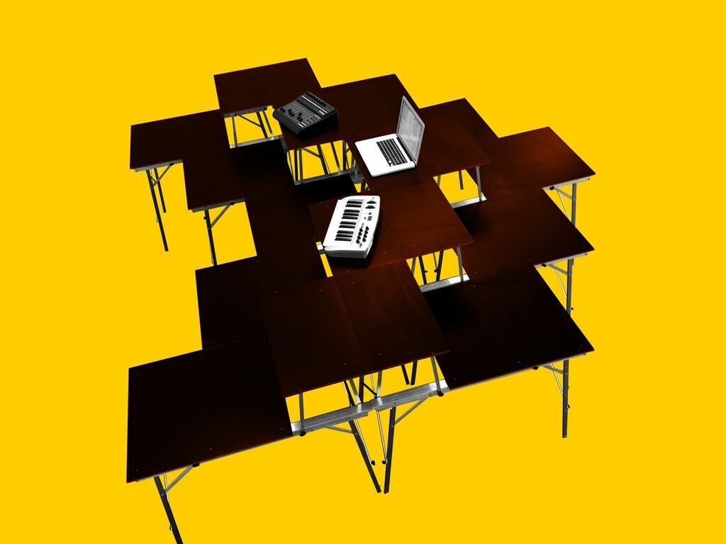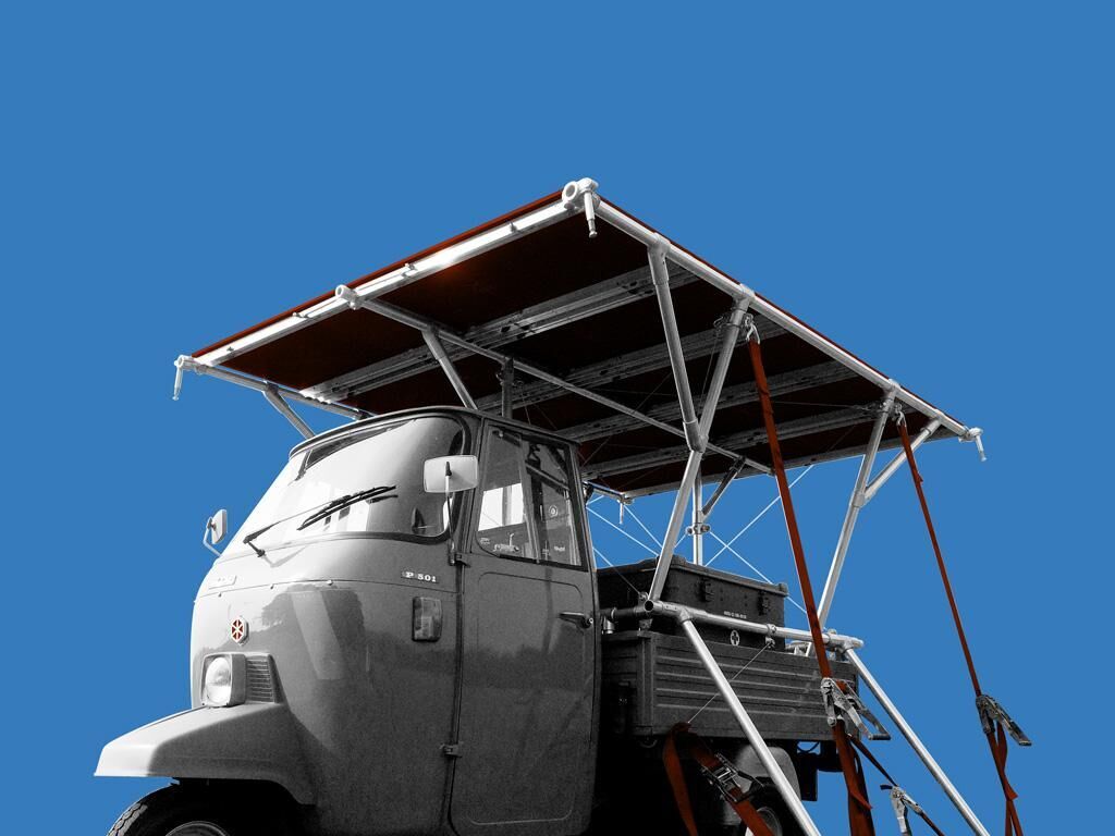 piano [pjano‘] - der Plan, das Programm, die Ebene, die Plattform, das Niveau, der Stand (adv.) leise, sachte, langsam, leicht ""Piano"" ist eine Plattform für Interventionen im öffentlichen Raum, mobiles Leben und Arbeiten. Aus Aluminiumrohren, Rohrverbindern und gespannten Stahlseilen ist auf der Pritsche einer Piaggio Ape P501 ein ausklappbares Gerüst montiert. Mit dem kleinen, starken und besonders wendigen Mobil kann man in die kleinsten Ecken urbaner und natürlicher Räume vordringen und instantan variable ephemere Räume errichten. Das modulare System erlaubt die vielseitige Gestaltung verschiedener Raumkonzepte unterschiedlicher Kohärenz. Fließende Räume, die sich mit ihrer Umgebung verbinden. Das Definieren von Raum, als Arbeits- und Lebensraum, für Interventionen, ortsbezogenes Arbeiten und performative Aktionen steht in seiner vielgestaltigen, modularen und mobilen Form entgegen der weitläufigen Idee, die Stadt, den kulturellen Raum, als ein eher fixes und stationäres Konstrukt zu verstehen und ist damit auch Referenz zu Stadtutopien avantgardistischer Architekturgruppen wie Superstu dio, Archizoom, Archigram oder Ant Farm, die ihren örtlichen und zeitlichen Ursprung, ebenso wie die Ape, zu großen Teilen im Italien der 50er/60er Jahre finden. Ein Hauptaspekt der Konstruktion liegt darin, aus einem Minimum an Raum, Material und Gewicht ein Maximum an Form, Fläche und Nutzen zu schaffen. Die klappbaren Füße und Streben werden durch robuste Spanngurte eingestellt und unter Spannung gebracht. Durch dieses Netz aus Kompressions- und Tensionskräften ensteht ein äußerst stabiles Gerüst mit einer guten Kräfteverteilung. Ein wesentliches Element stellen die 10 Platten dar, welche sich in 2 Reihen á 5 Stück in das Gerüst einklemmen lassen. Durch diese lässt sich in etwa 2m Höhe nicht nur die 2x3m große Plattform errichten, sie bilden auch eine wesentliche Grundlage der Gestalt und Funktion der unterschiedlichen Räume. Bei jeder dieser Platten lässt sich ein Drittel der Fläche aufstellen, so dass diese auf der Plattform als Tisch funktionieren. Die Platte lässt sich in beiden Richtungen in das Gerüst integrieren, so dass der Tisch sowohl außen wie in der Plattformmitte liegen kann. Darüber hinaus lassen sich die Platten auch jenseits der Plattform am Boden als stabiler Tisch aufstellen. Auch hier kann der eine Teil aufgestellt werden, so dass ein Tisch mit zwei Ebenen entsteht und damit eine erweiterte Funktionalität bietet. Ein teilweise oder komplett geschlossener Raum entsteht durch ein Zelt über der Plattform.