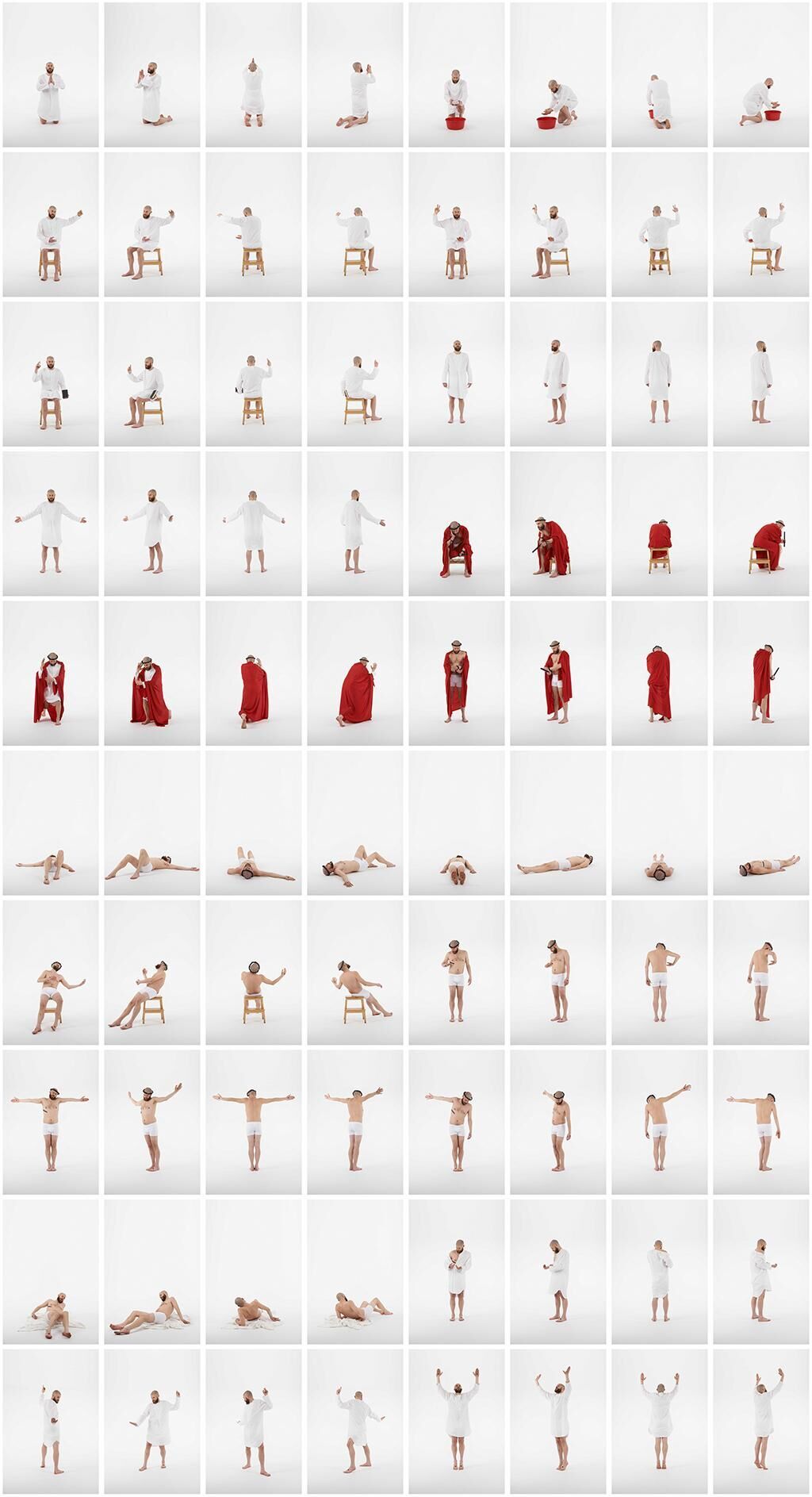 Diese Arbeit will nicht in achtzig Fotografien den Vergleich mit der ikonographischen Tradition zweier Jahrtausende aufnehmen. Würde die Zahl der gestalteten Bildfindungen noch so drastisch erhöht, eine solche Arbeit könnte nie die unglaubliche Schöpfungskraft aller vorangegangenen Künstler übertreffen. Diese Arbeit will nicht einzelne Bildfindungen in einen qualitativen Zusammenhang zu anderen setzen. In je vier Blickwinkeln (0°, 45°, 180° 225°) werden die einzelnen Bildtypen dargestellt. Für jede einzelne Ausrichtung wurde versucht, mit Hilfe der ikonografischen Tradition eine Bildlösung zu finden. In manchen Fällen fehlt eine Bildlösung in der ikonografischen Tradition aus folgenden nachvollziehbaren Gründen. Oft war die bildimmanente Aussage nicht mit der theologischen vereinbar. Man konnte sich zum Beispiel den Weltenherrscher, als salvator mundi oder pantakrator, natürlich nicht mit dem Rücken uns zugewandt vorstellen oder gar kniend. Oder Christus im Garten Gethsemane frontal zum Betrachter betend. Seltener fehlte oder mangelte es an Bildlösungen für eine bestimmte Ausrichtung, da sie sich aus gestalterischen Gründen weniger eignete. Als Beispiel stelle man sich den auferstandenen Christus mit dem Rücken zum Betrachter gewandt vor, den Finger des ungläubigen Thomas zur Seitenwunde führend. Später dazu mehr. In solchen Fällen musste mit Hilfe der eigenen Vorstellungskraft eine Bildlösung gefunden werden. Als Kriterien für die Bildmacht eines Bildtypus kann man folgende beiden heranziehen: Wird eine theologische Aussage unterstützt und ist die Bildfindung gestalterisch sinnvoll. Ob eine einzelne Bildfindung die anderen in gestalterischer Hinsicht übertrifft oder ob eine einzelne Ausrichtung die beabsichtigte theologische Aussage mehr oder weniger unterstützt, ist eine Frage, die schon die vorangegangenen Künstler sich zum Thema machten, und die in dieser Arbeit an den Betrachter weiter gegeben werden soll.