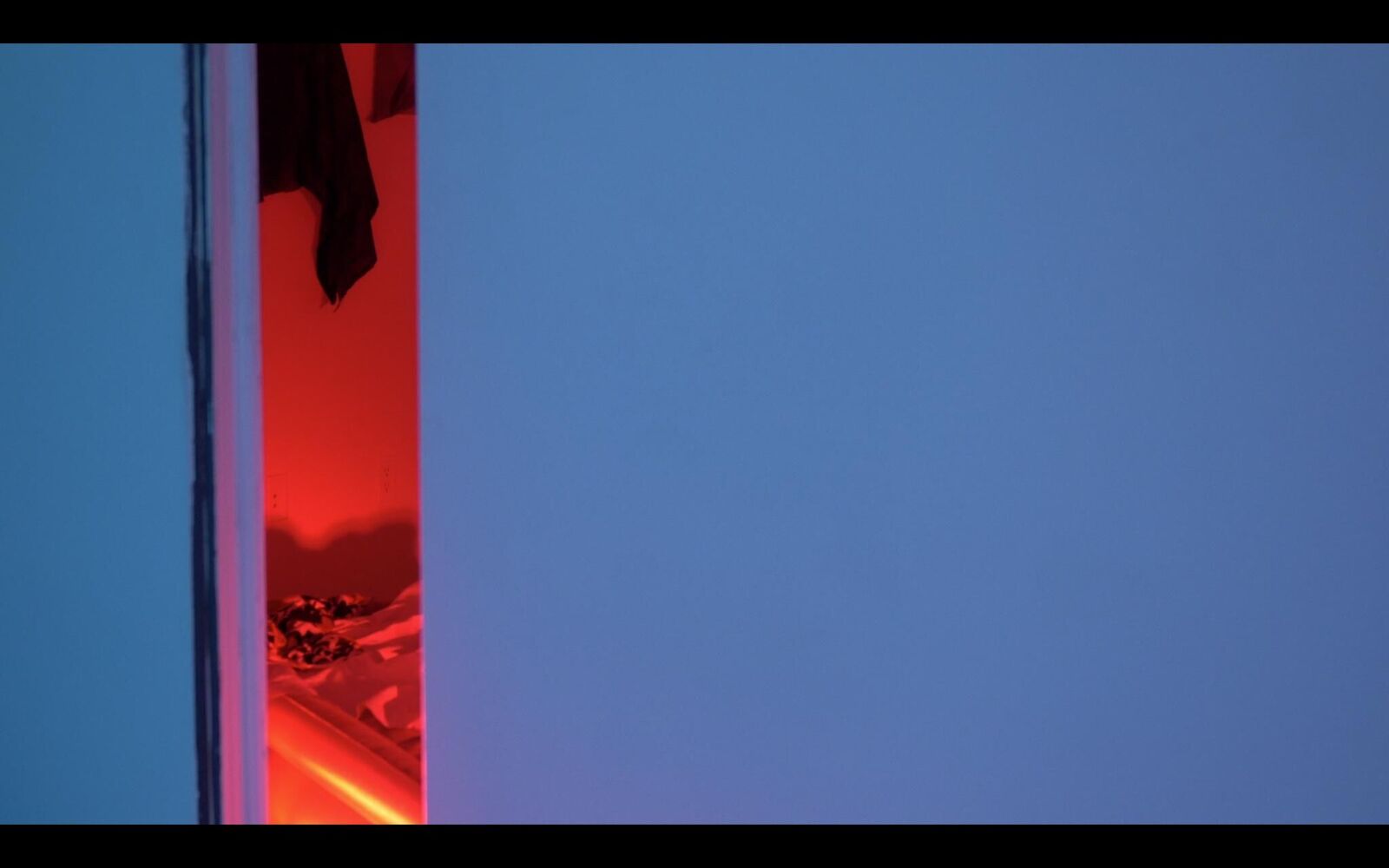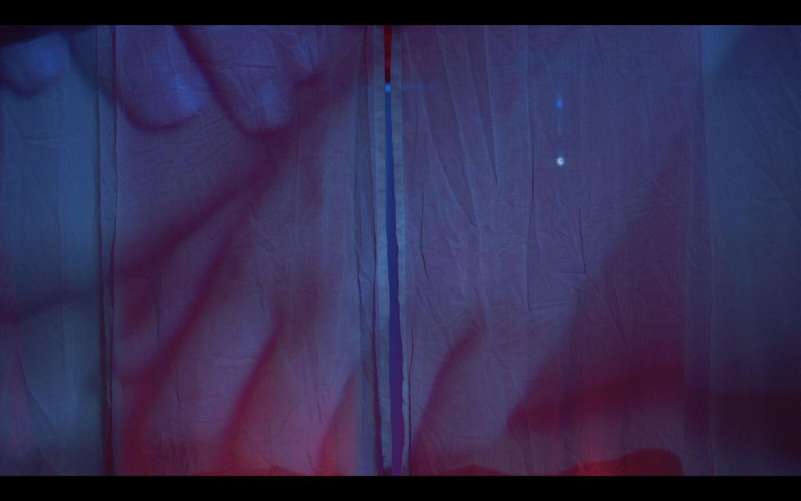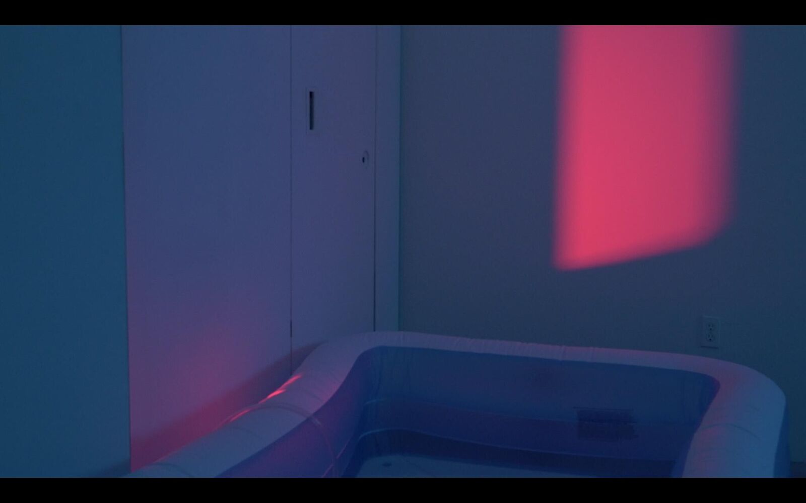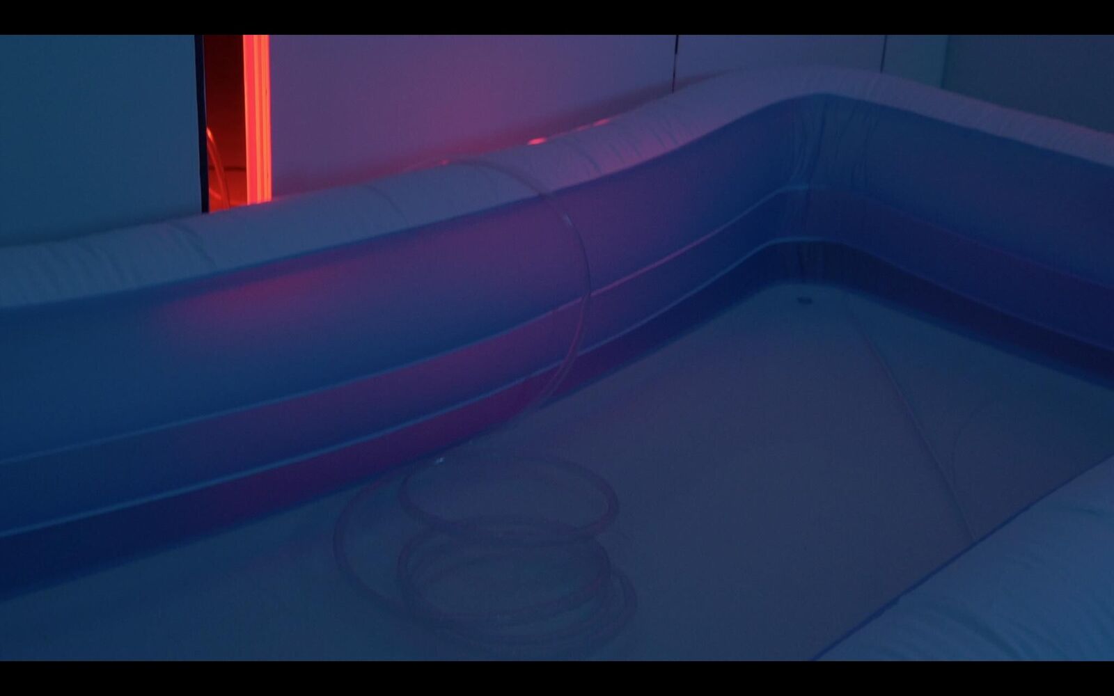 ""Half Past You"" is an installation piece by Lara Rodríguez Cruz. By means of sculpture, the artist invites the audience into a fictious space: the corner of our mind where we put the memories that we don’t want to deal with. The piece speaks with the subconscious and its inevitable release. Denial & guilt had an affair, and left the room untouched, a shrine to desire and loss. Lara Rodríguez Cruz is opening a crack in the room where we let dust cover our mistakes, to finally confront how they gain the weight of a dead object, filling themselves up with the very air that once allowed for levity and pleasure. The installation consists of a closed room, to which the audience has access, and a second room that can be seen from the first one, to which the only access is by looking in from the first room. When accesing the first room, the audience is confronted with only an object, a swimming pool, which lays in the empty space, lit with mellow blue light. When looking into the pool, there is a tube going into it, it is conducting air into the (slightly filled with water) pool, which causes bubbles to pop inside of it. The tube comes from a second space that is behind one of the walls (a wall constructed for the purposes of the installation, see sketches). The wall does not completely close the second space, it has a crack in the middle (two separate modules make the wall, see sketches).