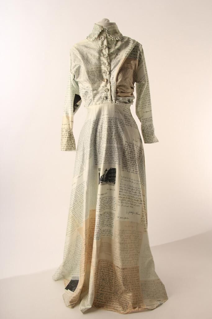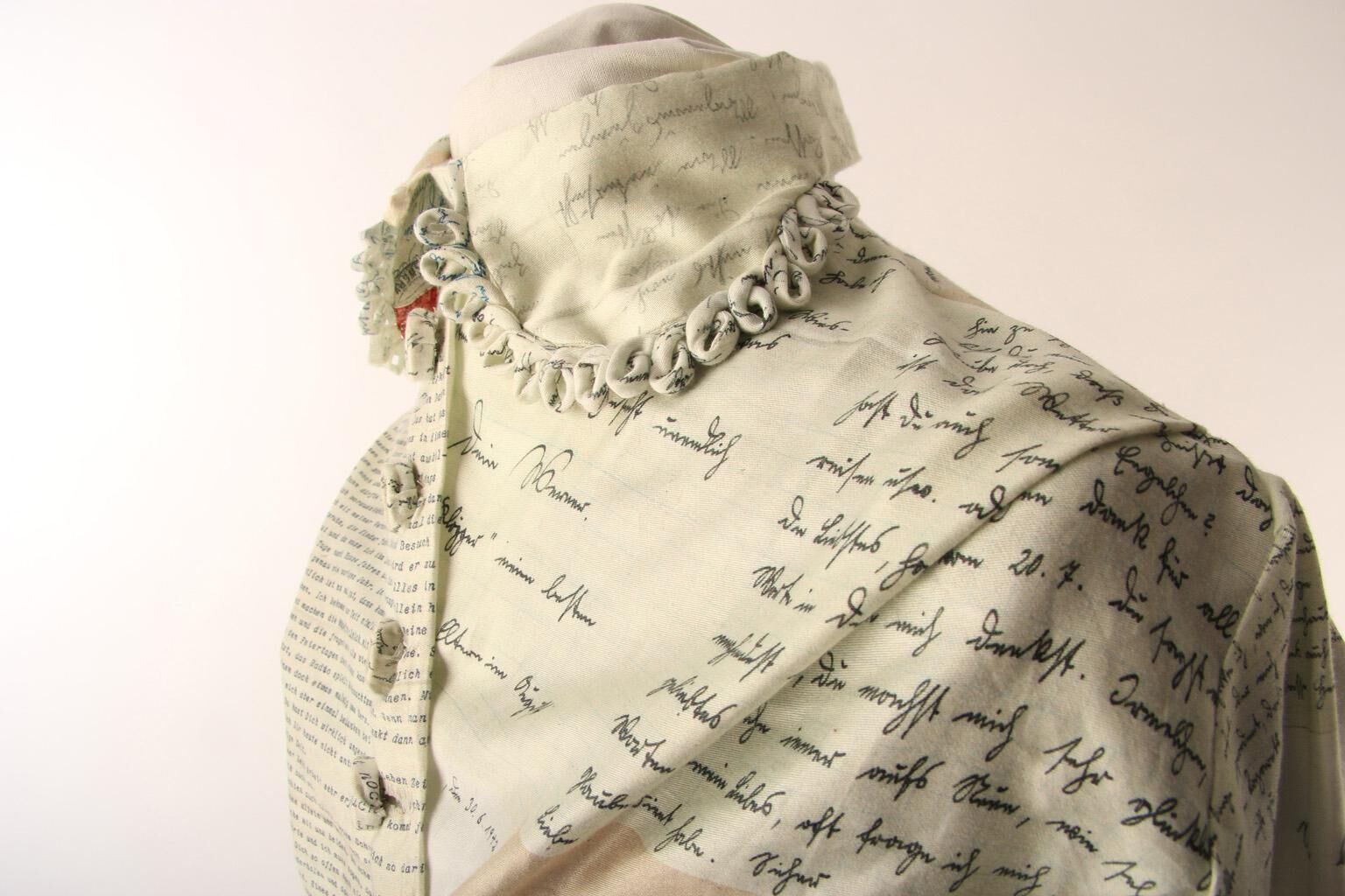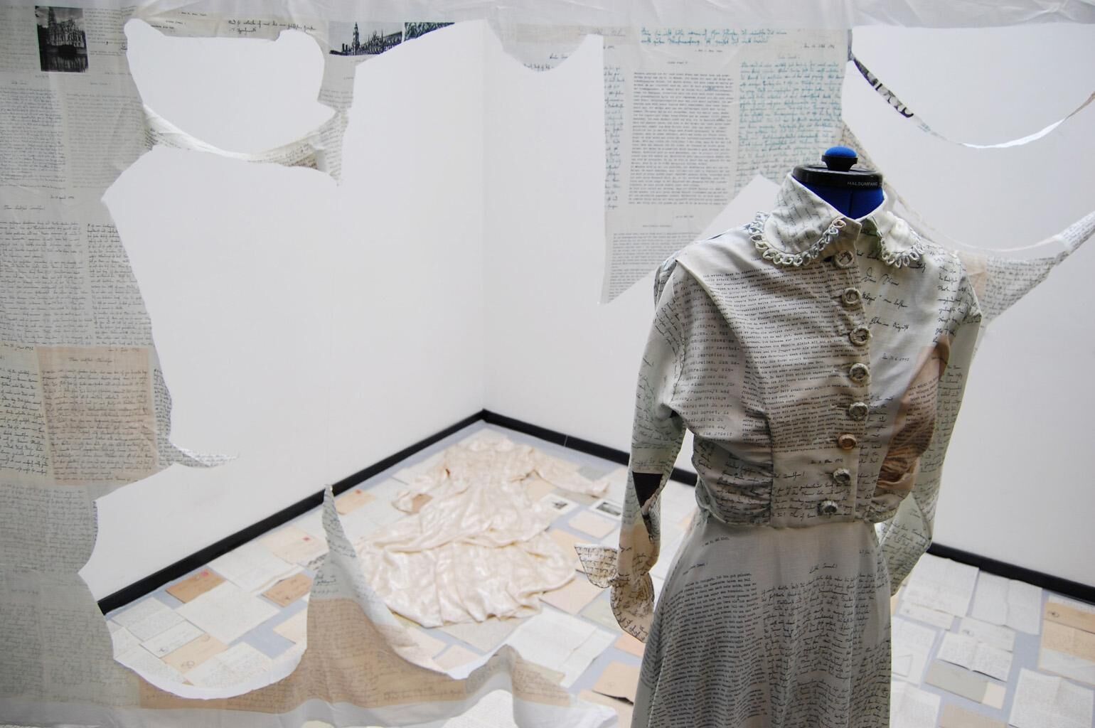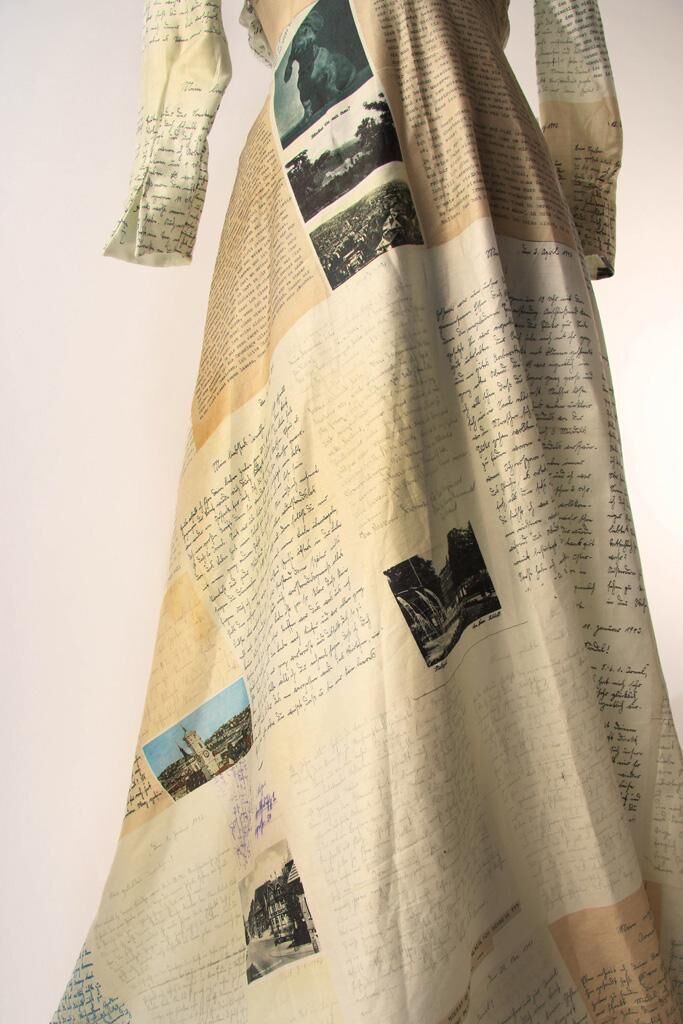 ""Meeting my grandparents"" is a wedding dress reproducing my grandmother's original dress pattern with 155 of my grandfather's army postal service-letters imprinted. The army postal service-letters used and the original dress itself were stored together in a box for years before being found in 2012 after the death of my grandfather. The new dress is a connection to the past as well as the question to which extent a family's past influences one's life today. A seemingly set picture of a person is taken apart and put together again with each new information. The new dress, the original dress, the letters and left-over pieces of fabric are put together, forming an installation.