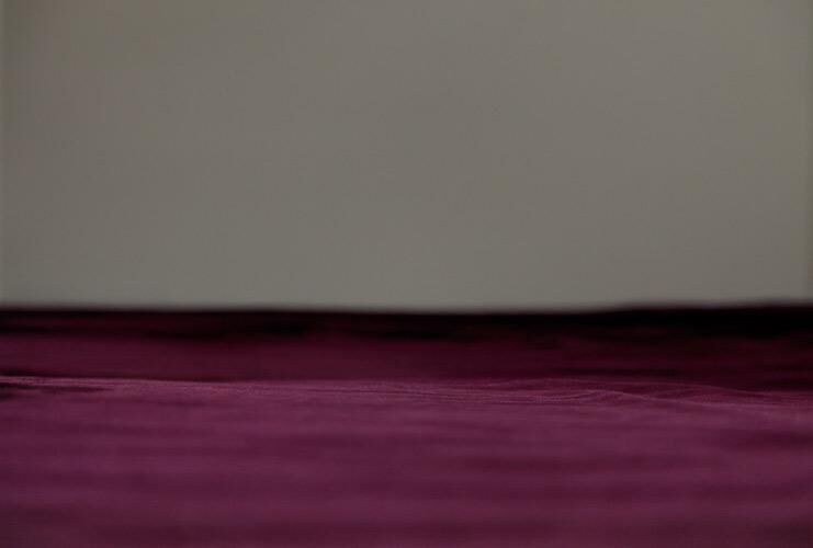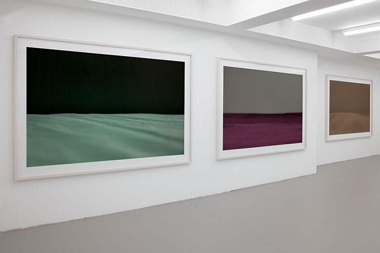 Nadine Decker zeigt drei großformatige Fotografien, die alle ein ähnliches Motiv zeigen: Eine farbige Wüsten- oder Wasserfläche, darüber ein schwarzer, grauer oder sandfarbener Himmel, die beides teilende Horizontlinie jeweils knapp unter der Bildmitte. Tritt man näher heran, um sich die Details im türkis-grünen Meer anzusehen, stellt man fest, dass es nur eine sehr schmale Schärfeebene gibt, wie eine dünne Linie kurz unterhalb des Horizonts. Es ist diese Linie, die die Illusion von Meer und weitem Raum zerstört. Aus den verschwommenen, sanften Wellenbewegungen des unteren Bildteils bilden sich an dieser Stelle Strukturen, die man aus anderen Kontexten kennt: fein gewebter Stoff, ein industriell gewebtes Tuch. So wird man als Betrachter wieder hinaus katapultiert aus der weiten Welt, auf die man sich gerade eingelassen hatte, hinein in die Enge und Privatheit eines Schlafzimmers. Was auf den Bildern zu sehen ist sind schlichte Bettlaken, so nah fotografiert, dass sie die Möglichkeit zur Transformation in sich tragen. Nadine Decker führt durch diesen im Grunde einfachen Illusions-Trick extrem gegensätzliche, sich fast schon widersprechende Orte zusammen. Und in diesem Kippmoment, zwischen dem Versprechen der romantischen Landschaft und dem einfachen Bett mit zerwühltem Laken, beginnt die sichere Navigation des Betrachters zu schwanken. Text: Wiebke Elzel zur Ausstellung “Navigation” im Case, Projektraum für Fotografie