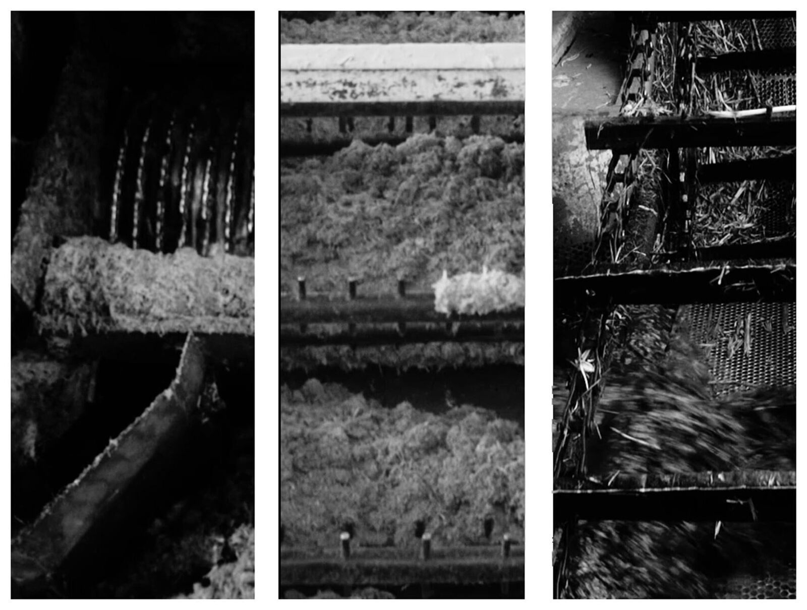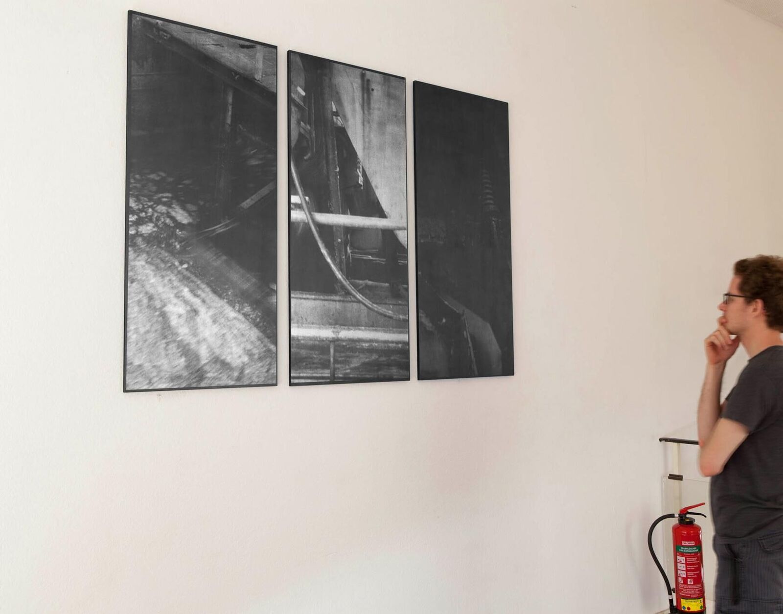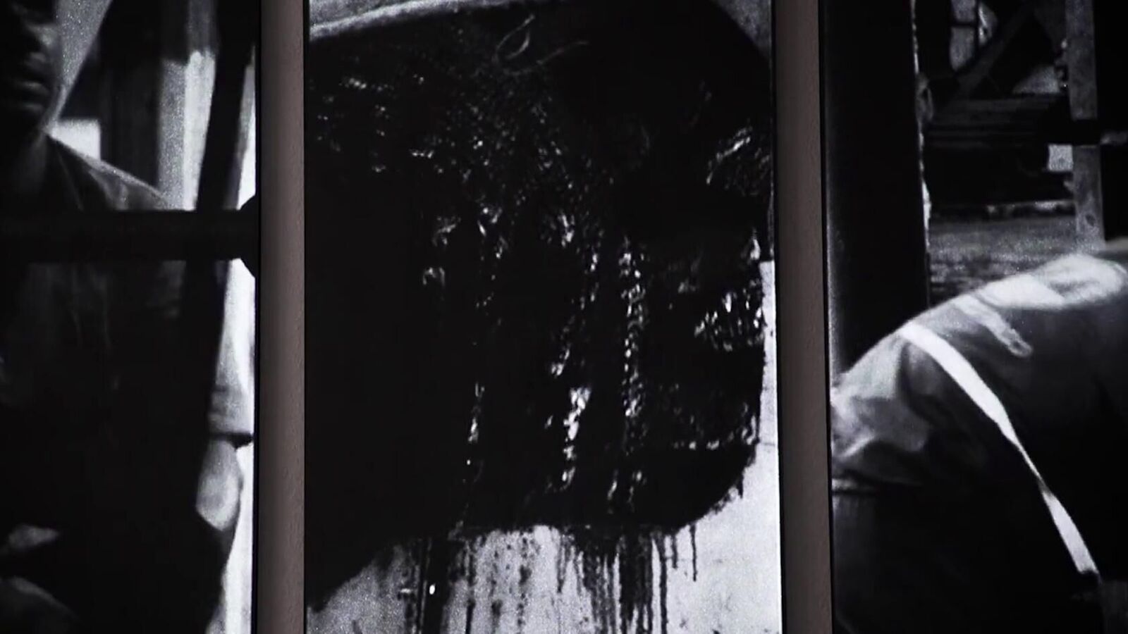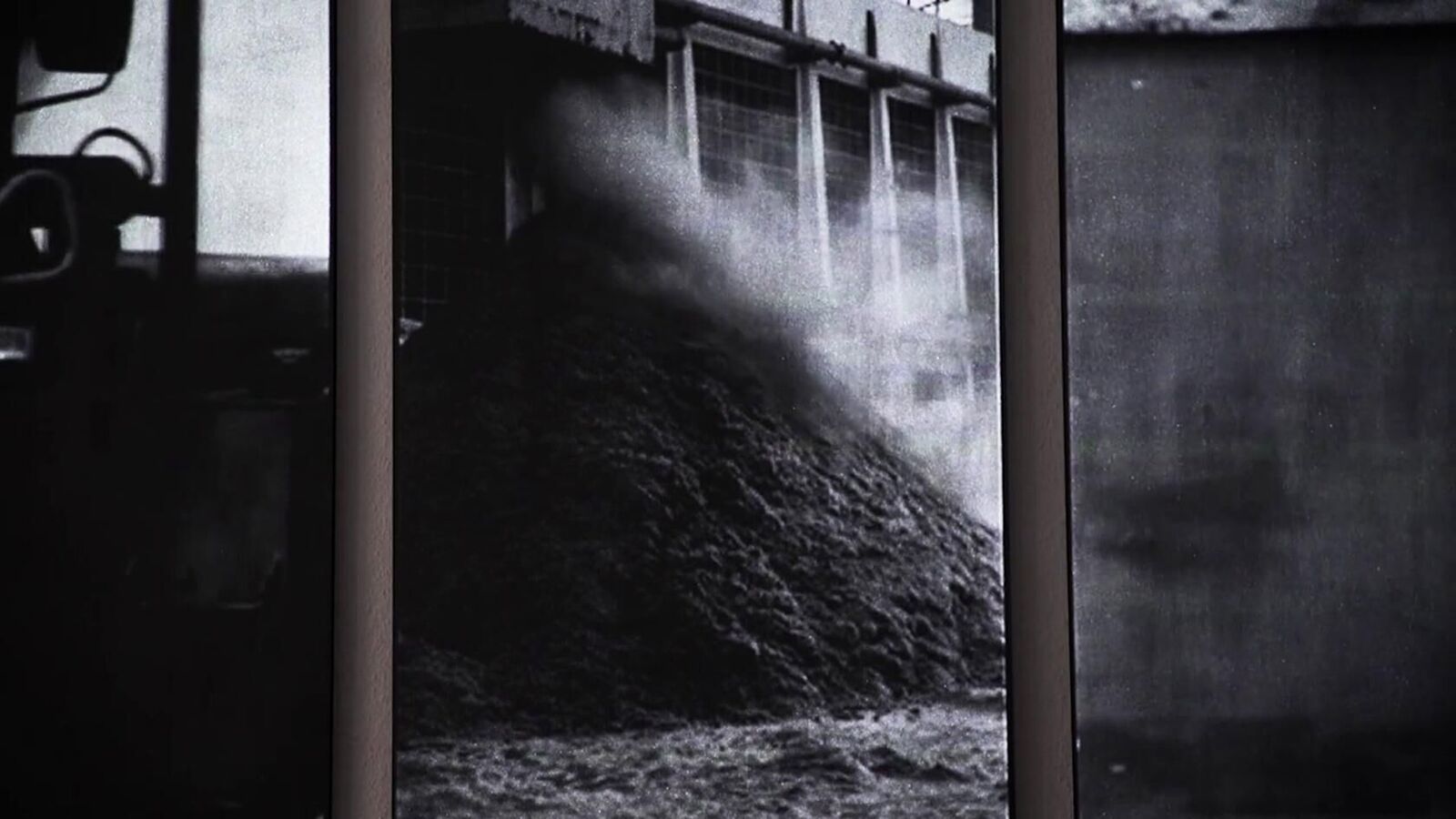Three-channel video installation with sound / projection on wood, black iridescent colour / 10 min loop / Man, machine and landscape as icons in a timeless circle. Eternal repetition. There is no evasion. The man as an unfree labourer for the machine... machines have no dreams. The mill grinds on and on.