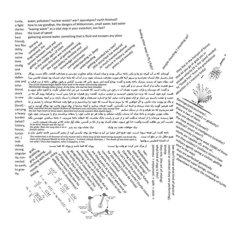 The performance lecture engages with the task of translating a very old parable from the iconic hybrid text of Panchatantra (Farsi: Kelileh o Demneh), using verbal communication, light and shadow, body and sound. The performance exercises the classics of storytelling as well as experimenting on the narrative elements of a story. Panchatantra, animal fables as old as we are able to imagine, has endured so much transformational torture in history, vanishing points and revivals; now it exists in old Farsi (with the title: Kalila and Dimna کلیله و دمنه) as an iconic transcript and witness for an old language hybrid of Farsi and Arabic. A reading of this story in English and collaboration with non-Iranian dancers opens thinking about contemporary themes along the voice of the ancients. When approached in a surgical carefulness, the story of The Turtle and the Two Storks (حکایت باخه و دو بط) provides a richness that allows rethinking with linguistic deconstructive tools. The story is already enriched by themes of literacy, science, friendship, space-travel, pollution, evolution, virtual space, language and speech.