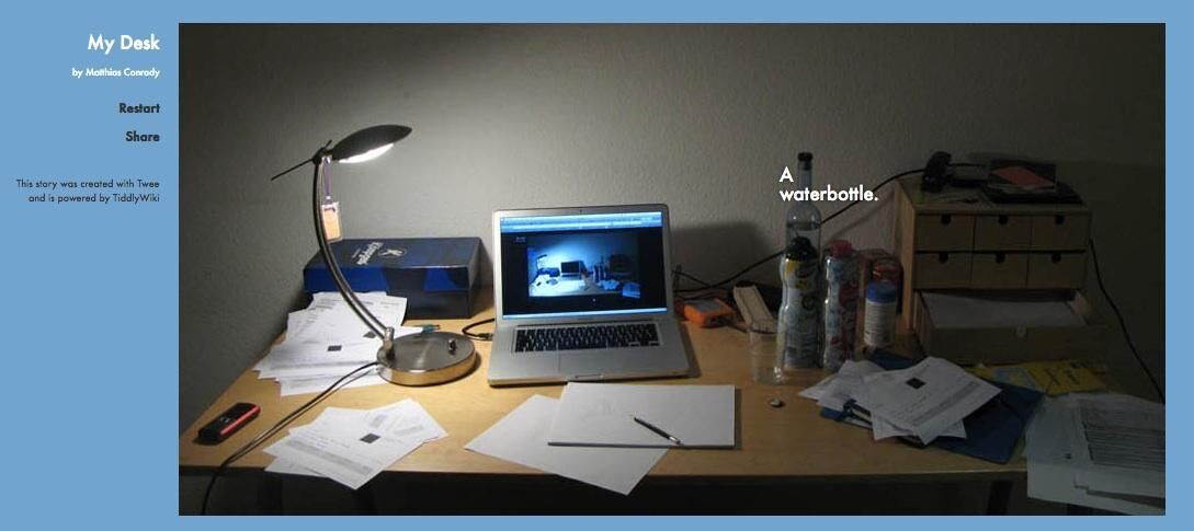 A simulation of the untidy desk of the artist at a specific moment in life, open to being examined.
