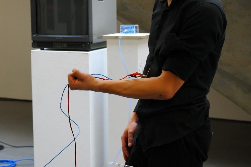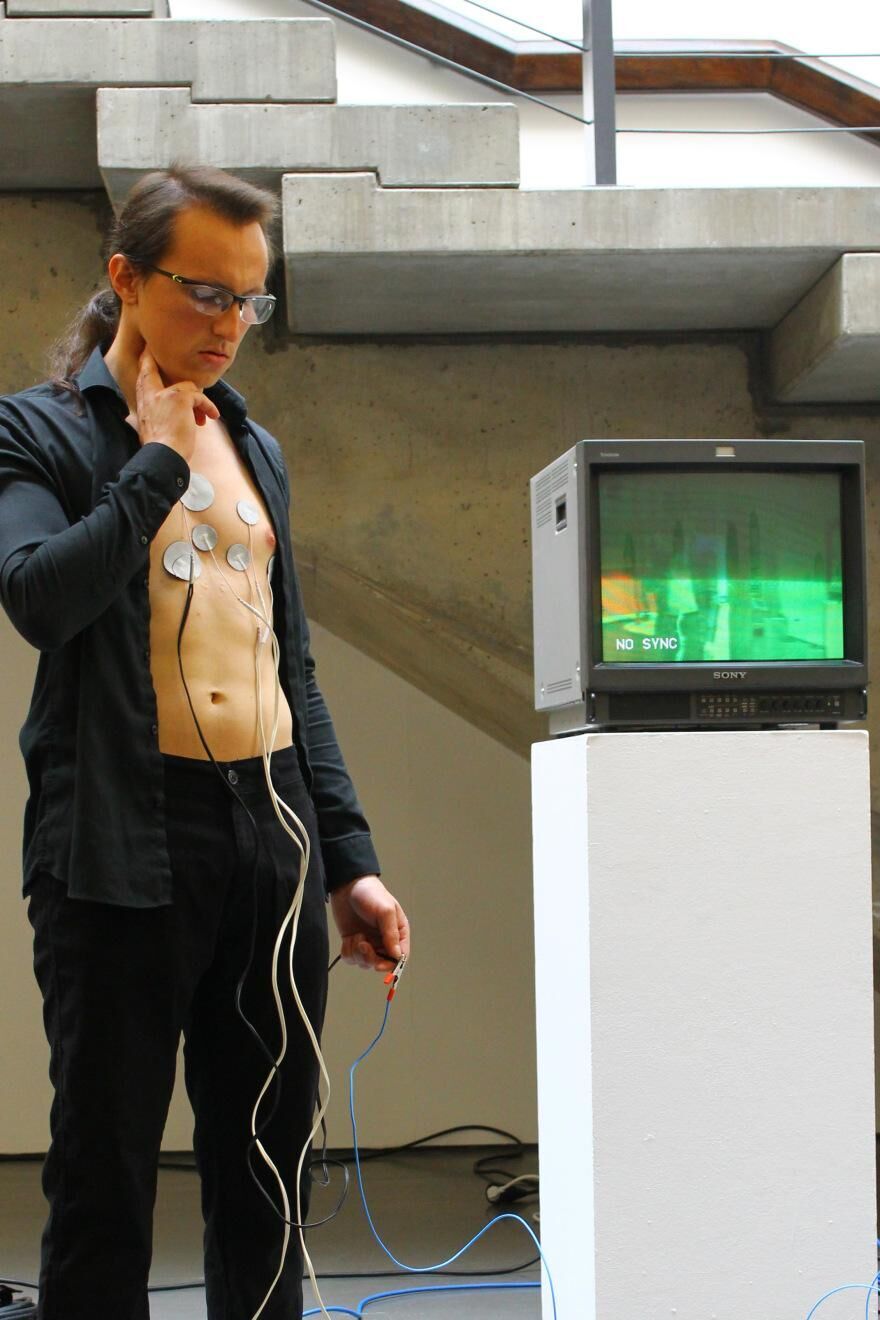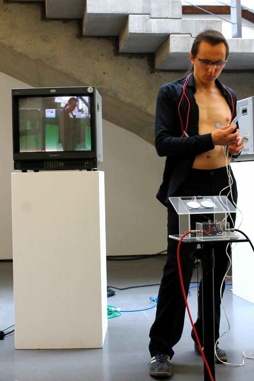 Video performance, where the body acts as a Connection between two different systems: Germany-Colombia. That symbolism is proposed as PAL and NTSC video signals, showing an inner language of cultures, merchandising and technological societies. Using the body as a medium, a mix of those signals happens in different stages: an exploration on the skin impedance; a lecture with special medical devices in the mouth, making the mix of signals possible; a connection with needles in order to send the video signal through the body, in which case the signal is mixed in muscles.