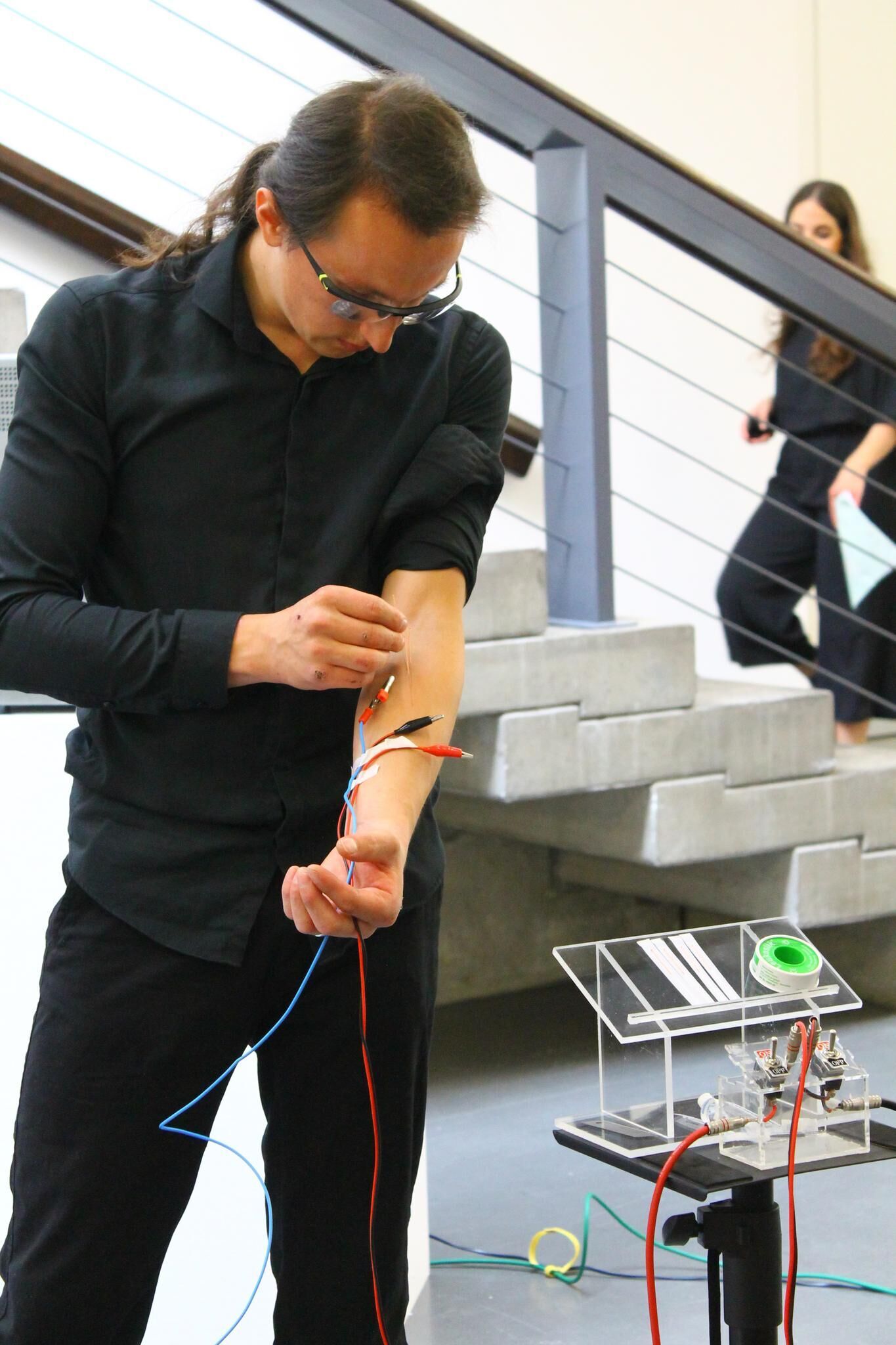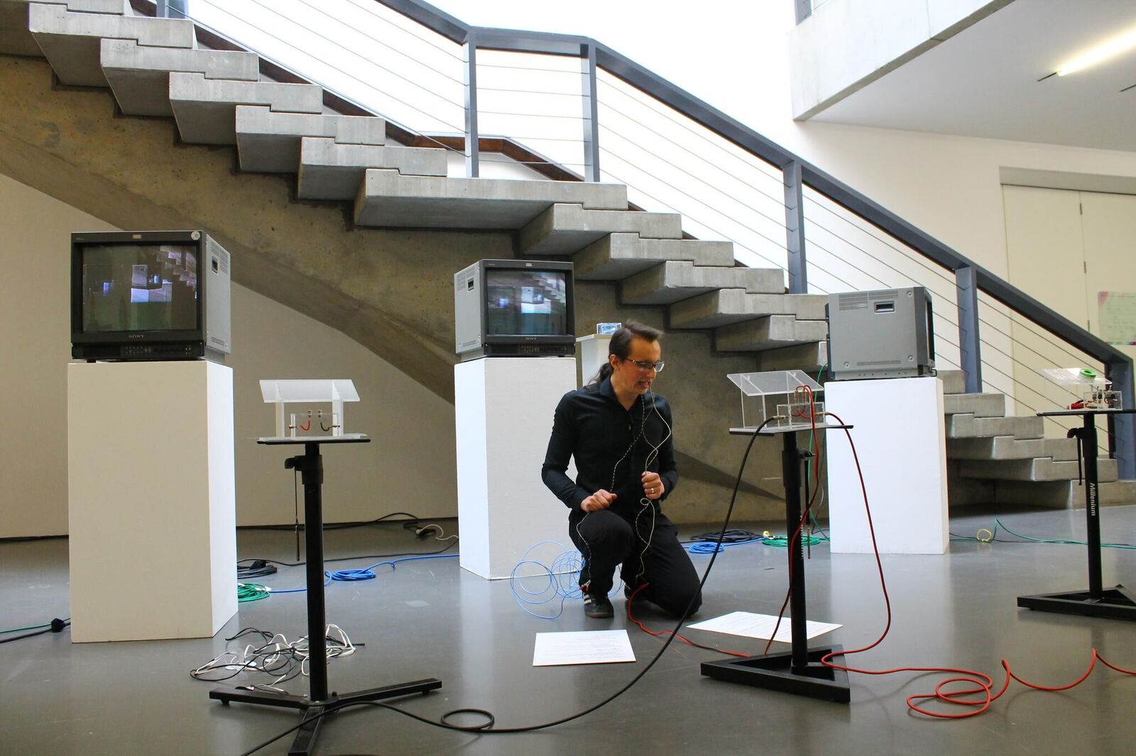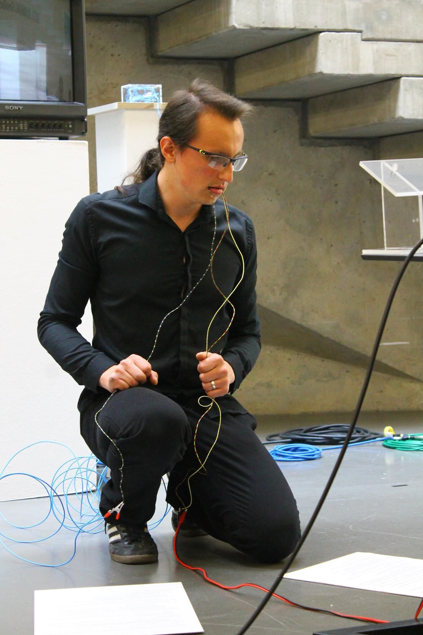 Video performance, where the body acts as a Connection between two different systems: Germany-Colombia. That symbolism is proposed as PAL and NTSC video signals, showing an inner language of cultures, merchandising and technological societies. Using the body as a medium, a mix of those signals happens in different stages: an exploration on the skin impedance; a lecture with special medical devices in the mouth, making the mix of signals possible; a connection with needles in order to send the video signal through the body, in which case the signal is mixed in muscles.