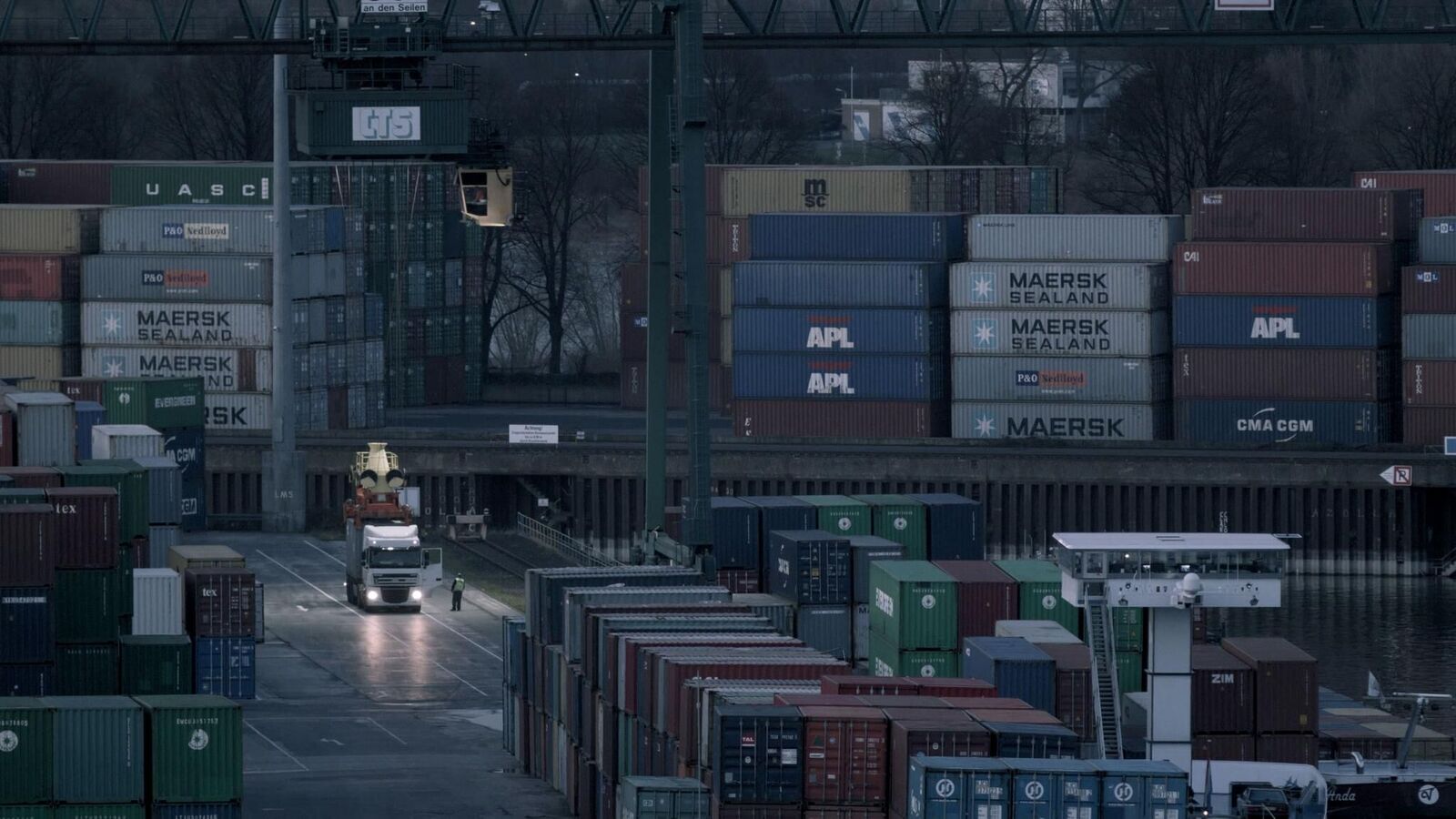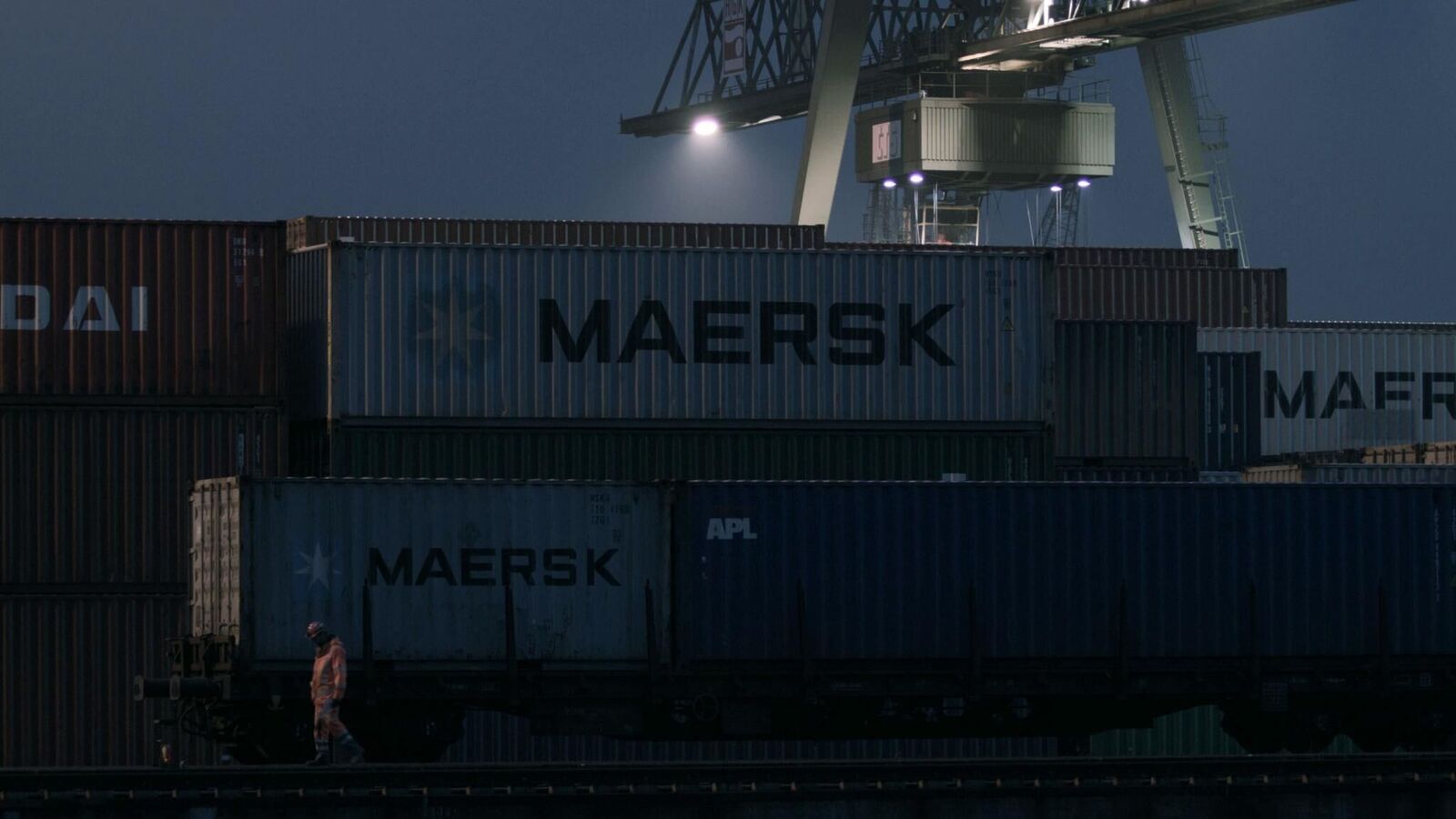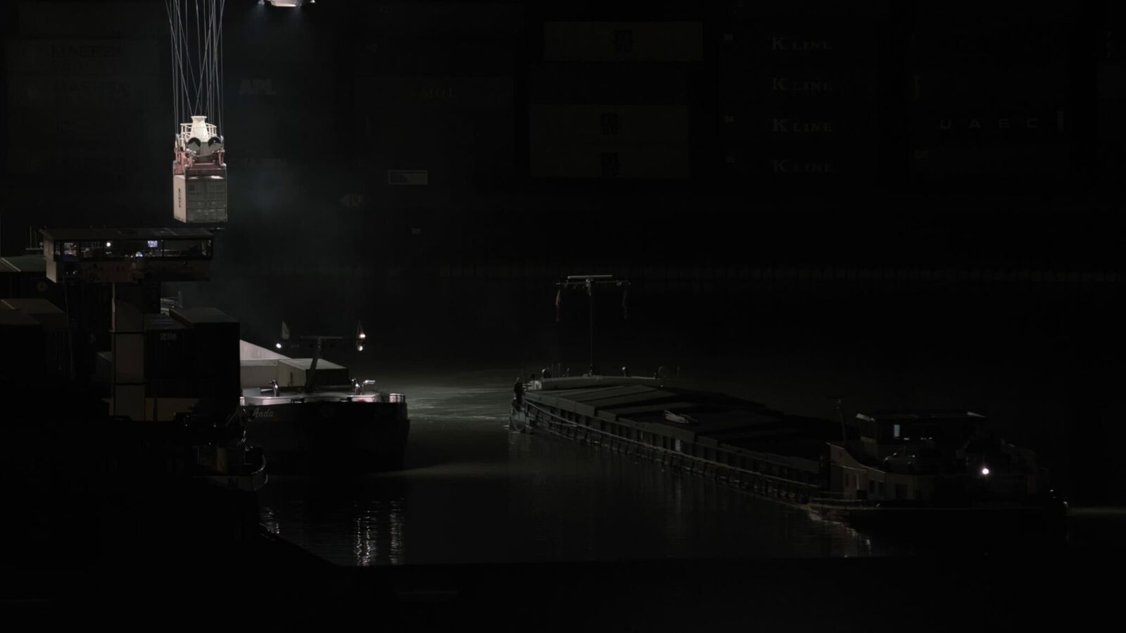 Equipment and loading mechanisms of a port area wander in constant motion rhythmically and purposefully along the quay. ISO containers in different colours are lifted and re-placed elsewhere, in between: moments of motionlessness and stagnation. Defeated by the machines in terms of size, some dock workers wearing bright orange safety jackets can be spotted in the middle of the loading and container bridges. During the approaching night, the processes around the port area appear in a different light, only shadows and silhouettes of the continuous machine processes remain. Monoscape shows fragments, shapes and movements of an industrial cycle. Through the calm and documentary images, the machinary processes gain a repetitive and ubiquitous dimension. Removed from their purpose-determined context, they seem like anonymous idle objects in an engineered landscape.