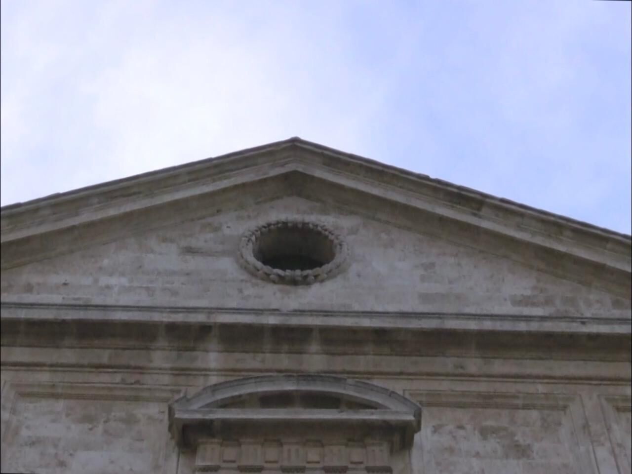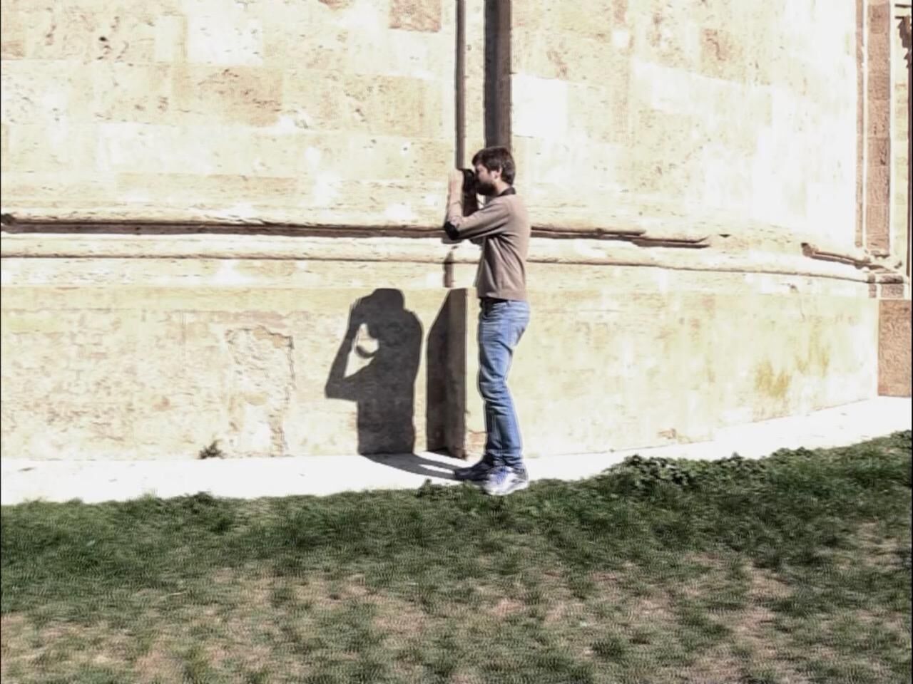 Ein Tourist geht um die Kirche Madonna di San Biagio in Montepulciano. Während seines Rundganges um die quadratische Kirche schießt er Fotos von diversen Positionen. Vier Mal, an den Ecken der Kirche, hören wir Klatscher und ihren Wiederhall aus dem Inneren, dem Mittelpunkt der Kirche. Der Tourist verschwindet ""innerhalb"" des Raumes von Kirchenschiff und Glockenturm. Das Bild schließt seinen Rundgang ohne den Touristen vor dem Eingang ab. Vier Einstellungen, jeweils an der Fassade der Kirche empor und 180° gedreht von der selben Position aus. Unterlegt sind die Bilder mit Glockenschlägen der Kirche. Entstanden im Rahmen des Kolleg für Musik und Kunst Montepulciano 2017.