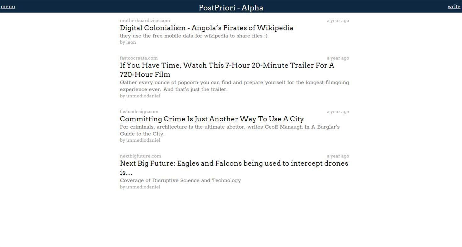 Postpriori: Concept and partial prototype for a social link aggregator. PostPriori will provide social news aggregation by those you personally trust and explore new ways to sift through the vast mass of good stuff out there. Trumpet Effects Controller: Midi Controller for Trumpets Keyboard Quarter-Note Firmware: 2 notes per key. decisive (app): a discrete method to make a truly random choice to: rid yourself of all responsibility; get a second opinion to disagree on; take a random walk; gamble; ask god for a sign.
