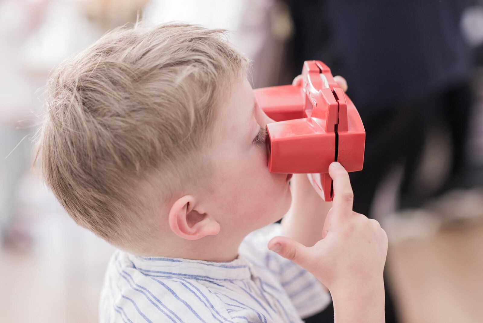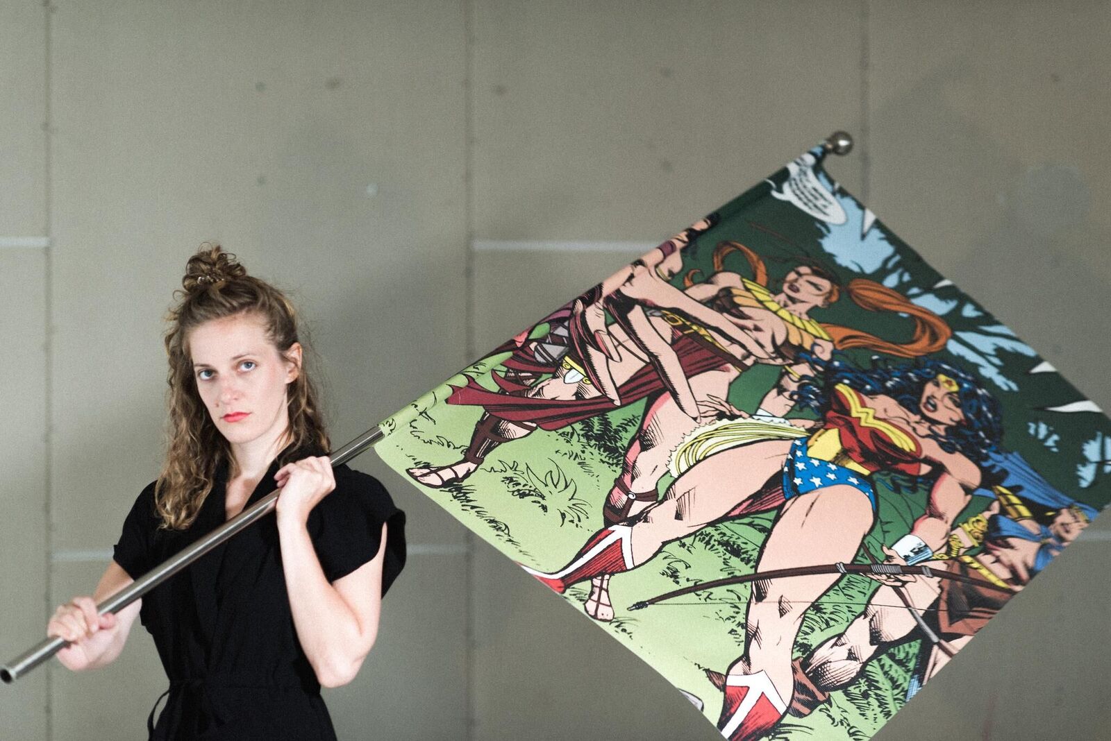 In a performative installation of five Viewmaster glasses, the work She Revolver (2018) focuses on the interplay of superheroes, toys and images of women. It deals with flags as a symbol and identity-defining feature of demarcation and the representation of women in comics and drawings. By staging three-dimensional images in children's toy goggles, two-dimensional perspective and three-dimensional realities are shifted into one another and question their own order.