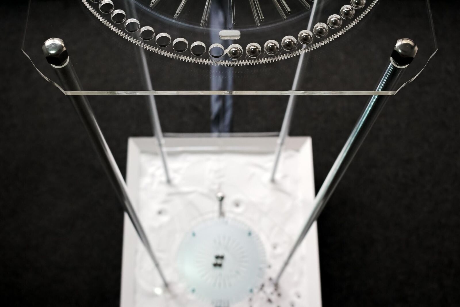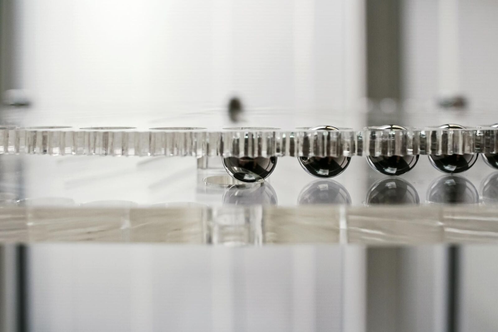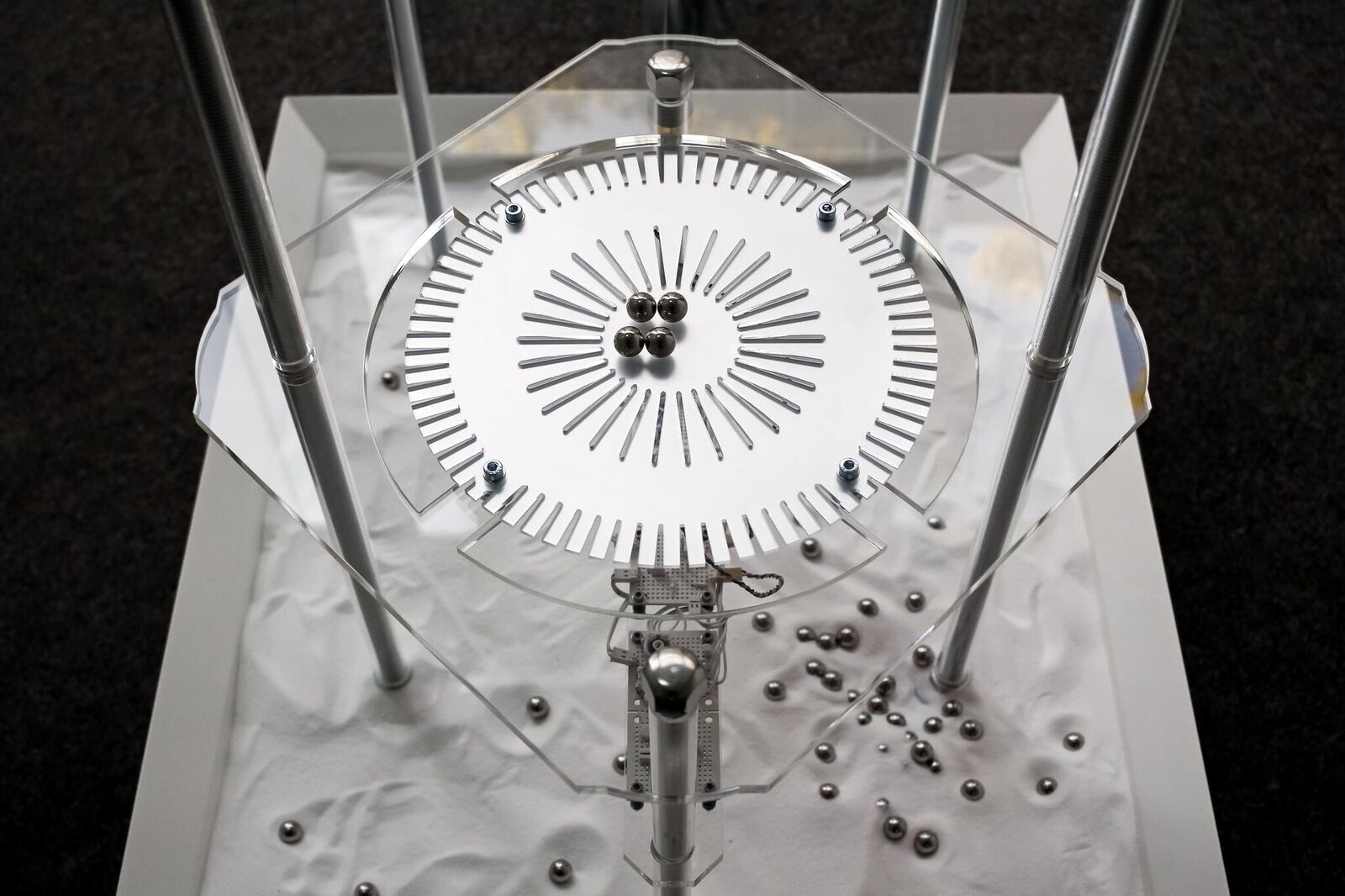 uf der Oberseite dieser kinetischen Skulptur bilden hunderte, verschieden große Stahlkugeln chaotische Formen und Strukturen, welche sich durch langsame Bewegungen konstant umgestalten. Die Gebilde die sich so ergeben, erinnern an molekulare Strukturen und ihre Entstehung unterliegt einer physikalischen Unvorhersehbarkeit. Nicht nur visuell, sondern auch akustisch lässt sich der Prozess der dauerhaften Neuordnung wahrnehmen. Die aneinanderstoßenden Stahlkugeln erzeugen eine subtile – aber deutlich wahrnehmbare – Klangkulisse aus metallischen Klick-Geräuschen und einem sanften Dröhnen, welches durch die Bewegungen auf der Oberfläche entsteht. Jede einzelne Kugel steht in direkter oder indirekter Beziehung zu den anderen Kugeln. Unentwegt lösen sich alte Strukturen und Cluster auf und lassen so neue Formen und Ordnungen entstehen. Im Jahre 2014 entstand eine erste, skizzenhafte Version dieser Skulptur, mit dem Arbeitstitel: „~20*10 ~20*8 ~150*6 ~100*4 ~298*3“. Im Jahre 2018 erfolgte eine vollständige Überarbeitung des Werks.