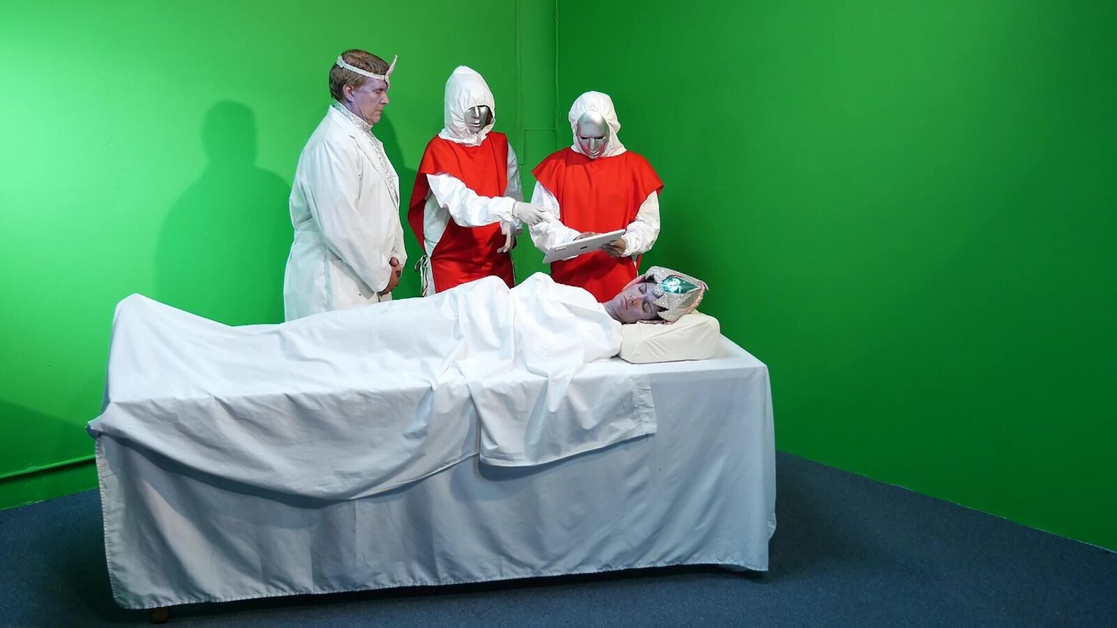 Orion Debacle depicts the group of nine Unariun students in the filming process of a psychodrama. They are collectively regressing to the time of ancient society called Orion. Orion - prequel to submerged continent of Atlantis - was highly developed techno- theocratic society that existed 19 million years ago. According to Unarius, Orion was also a primal cause of Smiljanić’s current epileptic condition. Orion Debacle is a story of estrangement that unravels the craving appetite for self-improvement and peculiar tools that humans use to attain it.