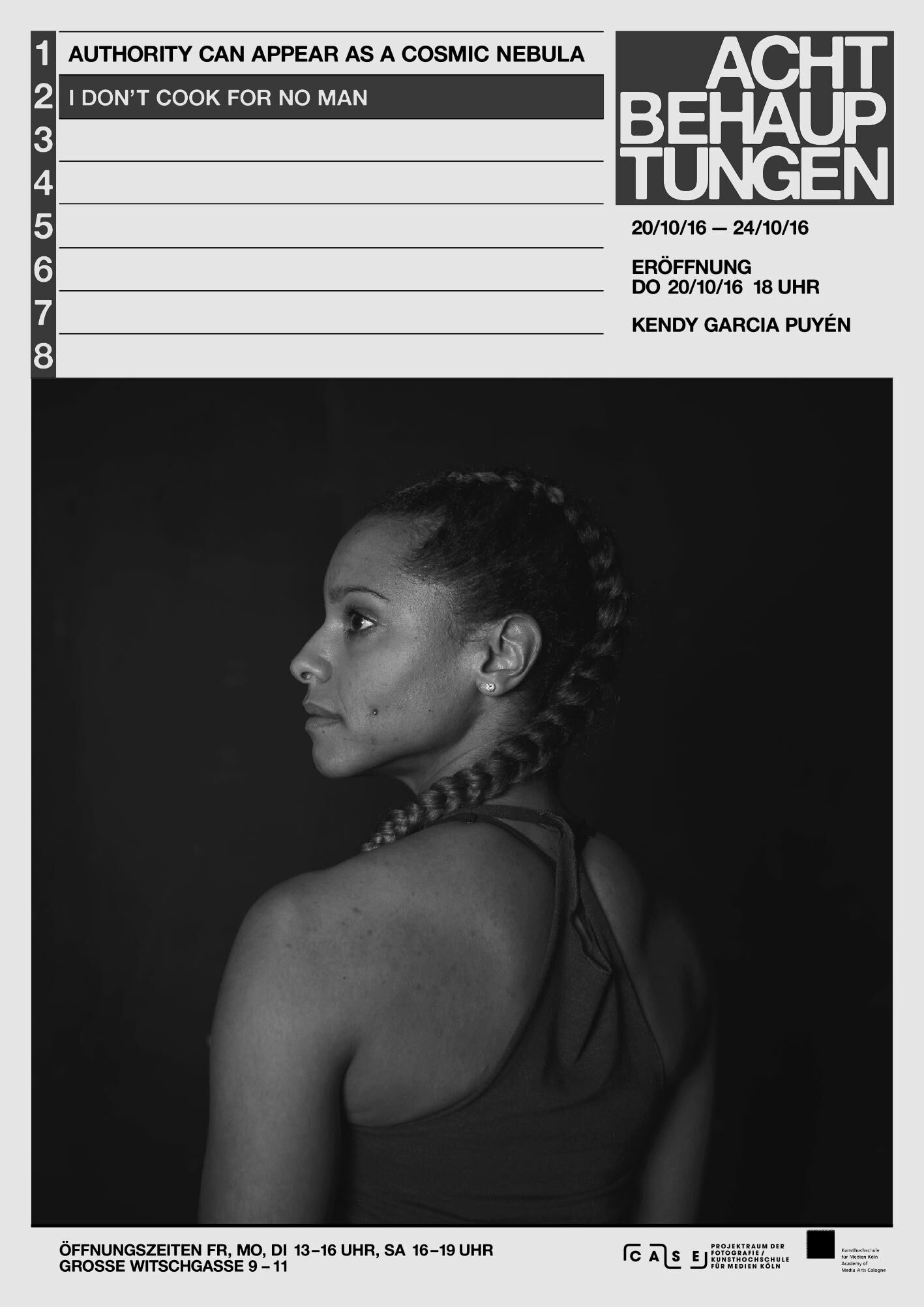 Lebensgroß abgebildet umringen vier starke Frauen den eintretenden Ausstellungsbesucher, die Wände sind schwarz, die Frauen auf den Fotos reißen und stoßen große Hanteln. In ihrer ersten Einzelausstellung im Case setzt sich Kendy Garcia mit dem Frauengewichtheben auseinander, dies nicht allein aus einem Interesse für die zur Schwerathletik zählenden Sportart, vielmehr behauptet die Künstlerin, dass das Frauengewichtheben einen soziologisch exemplarischen Charakter hat. Garcia sieht ihre Arbeit als ein Beitrag zu einem differenzierten Genderdiskurs, der unterschiedlichste Ausprägungen von „Weiblich“ und „Männlich“ zulässt. Die von Garcia fotografierten Frauen entsprechen nicht einer vordergründigen Erwartung an gewichthebende Frauen: dokumentiert sind keine muskelbepackten Kraftprotzinnen, sondern vielmehr Frauen in hochkonzentrierter Spannung am Anfang oder Ende einer ausgeführten körperlichen und mentalen Hochleistung. Auf dem Plakat der Ausstellung ist ein Porträt einer Gewichtheberin zu sehen. Der Titel der Ausstellung „I Don’t Cook For No Man“ verlässt auch das Feld des Sportes, der Satz ist vielmehr im häuslichen Verhältnis der Geschlechter verankert. Geschickt wählt Garcia die Sprache - ein Umgangsenglisch mit bewusst implementierten und kultivierten Grammatikfehlern - und verweist so darauf, dass jede eingenommene Geschlechterrolle innerhalb eines spezifischen gesellschaftlichen Rahmens zu denken ist. (Text von Beate Gütschow)