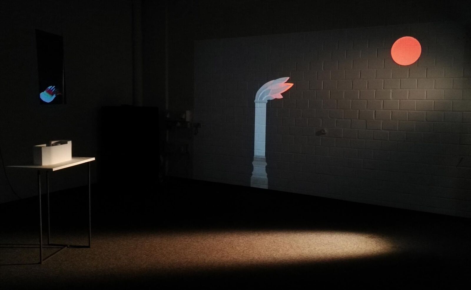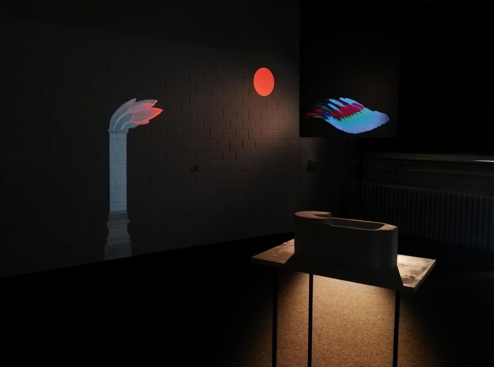 ""Echos disorder"" uses architectural vocabulary of religious buildings. White object that defined with simple lines and shapes, combined together with animation projection, creates juxtaposition with what seems to be modern architecture models such as Bauhaus with imagery that stems usually from middle age paintings or ancient eastern ruins elements, as well as ornamental motives. The idea of using the architectural model started in my recent solo exhibition; there I transformed Erwin Heerich's two-dimensional drawings into a three-dimensional model of a swimming pool.