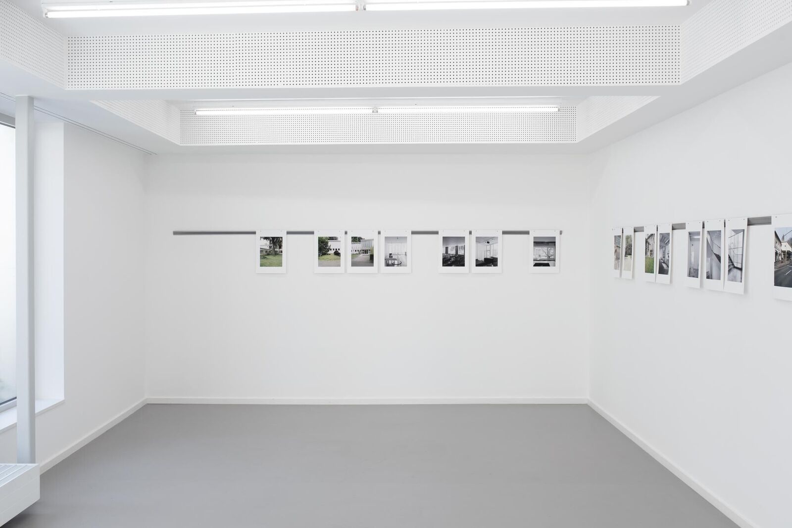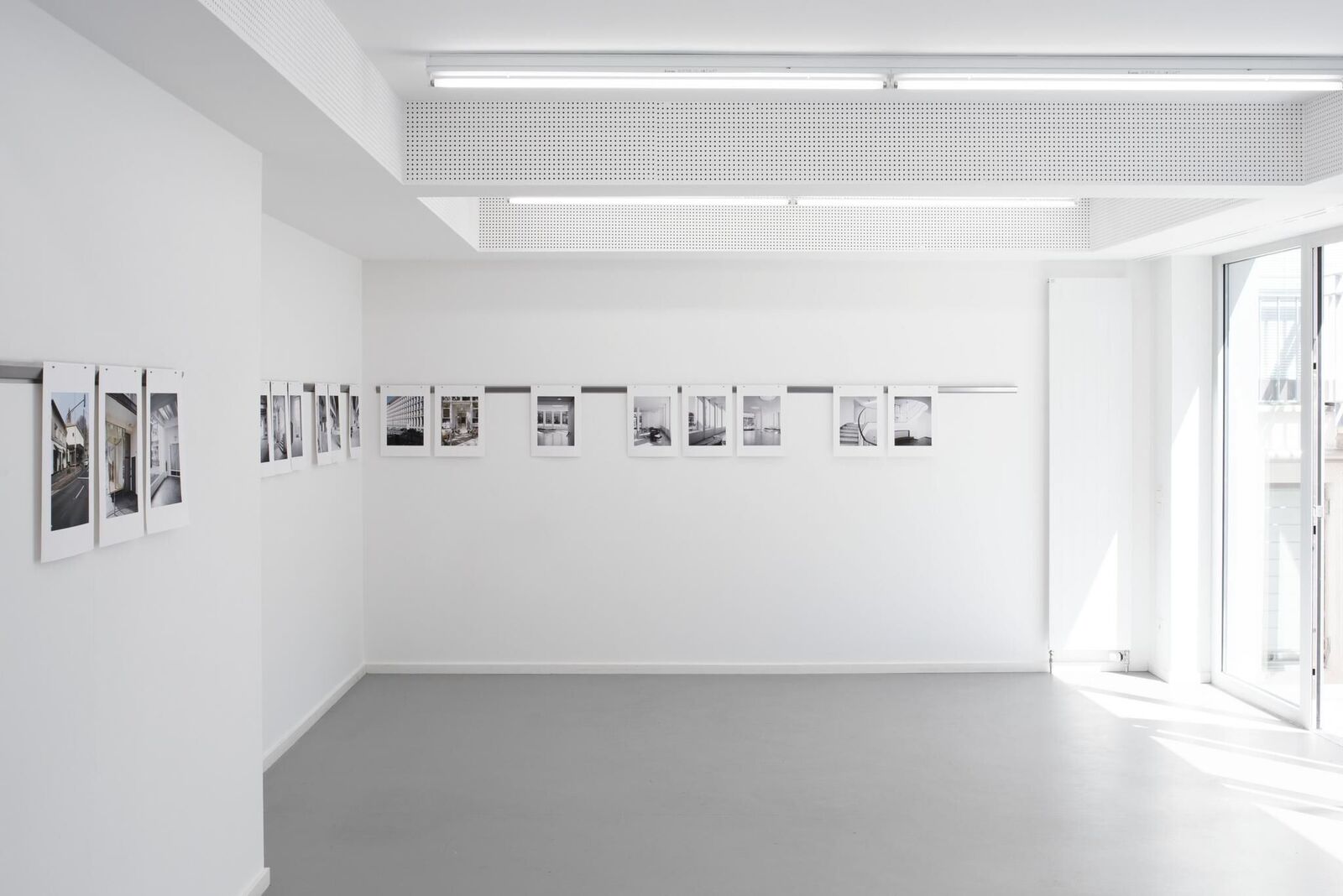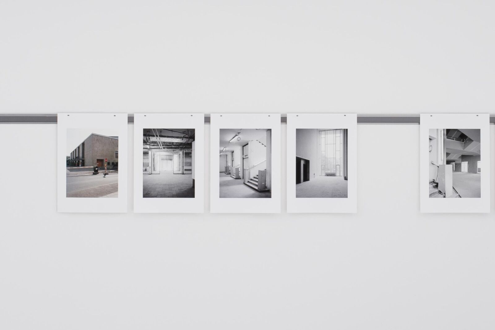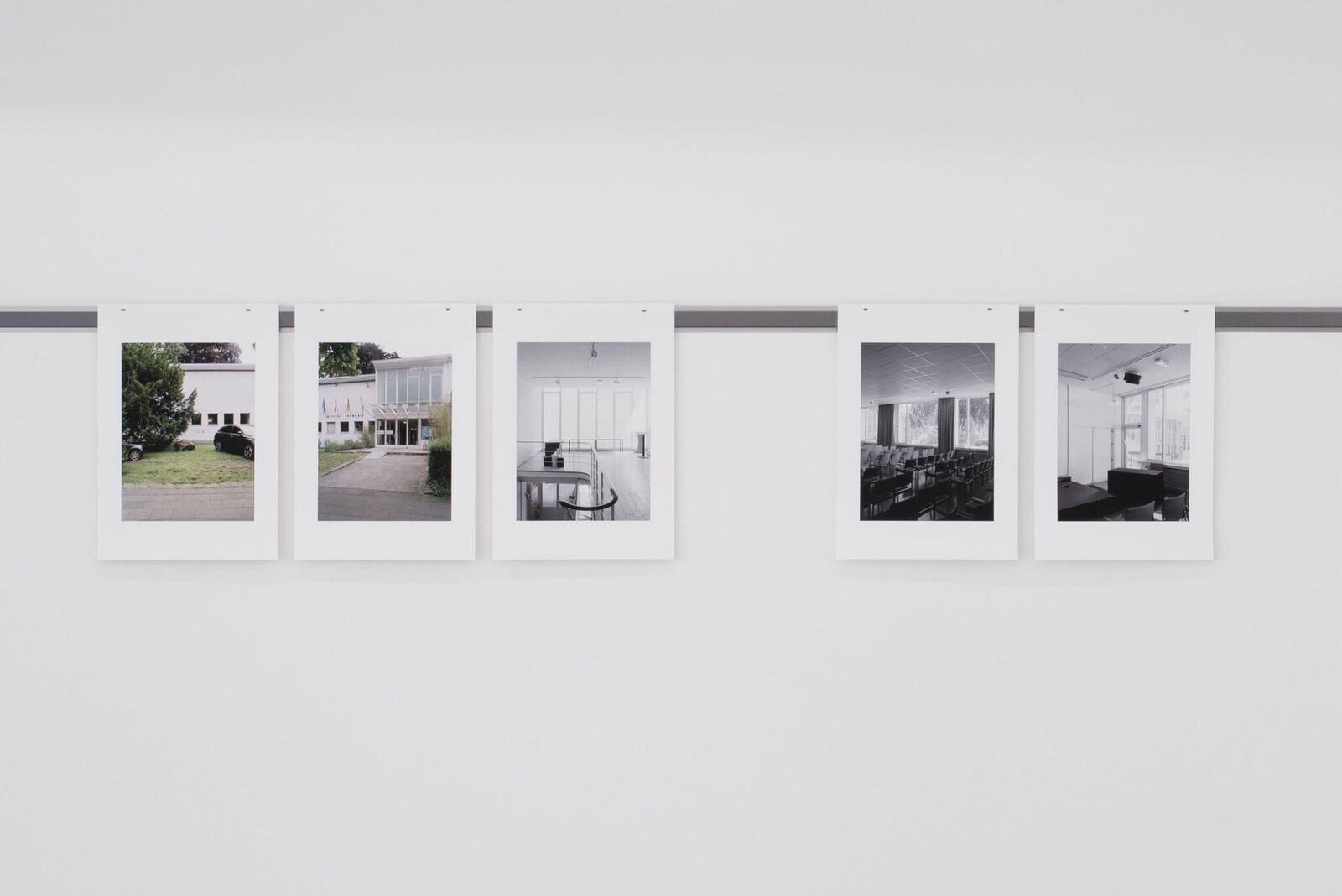 Die fotografische Arbeit 'Inzwischen' beinhaltet eine Dokumentation resp. Ansichten von vier verschiedenen Gebäuden des Architekten Wilhelm Riphahn. Alle vier Gebäude stehen durch ihren zeitnahen Entstehungsraum von 1949 - 1957, die Verwendung gleicher Materialien und architektonischer Elemente sowie ihre öffentliche Zugänglichkeit in einem engen Zusammenhang. Durch die zentrale Platzierung im Stadtkern Kölns ist ihre Bedeutung für den Wiederaufbau erkennbar. Zudem spiegelt die unterschiedliche Nutzung der Kultur- und Bürogebäude eine der Nachkriegszeit geschuldete Nachfrage. Mit einem Vergleich, in Form einer Aneinanderreihung von schwarzweißen Innenaufnahmen und farbigen Außenaufnahmen, werden Unterschiede, die hauptsächlich durch die jeweilige Nutzung bedingt sind, und Gemeinsamkeiten der Architekturen deutlich. Die einzelnen Bilder sind an einer Stahlleiste mit jeweils zwei Magneten auf Augenhöhe des Betrachters montiert. Die Art der Hängung betont den dokumentarischen Charakter der Ansammlung.