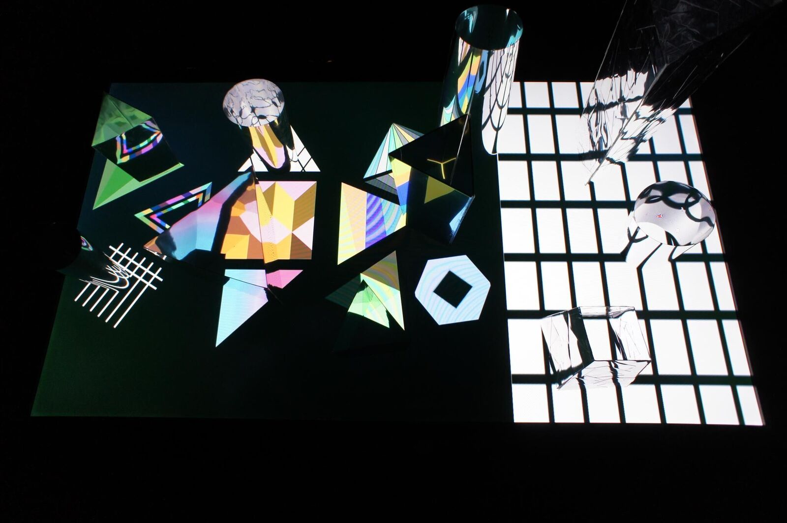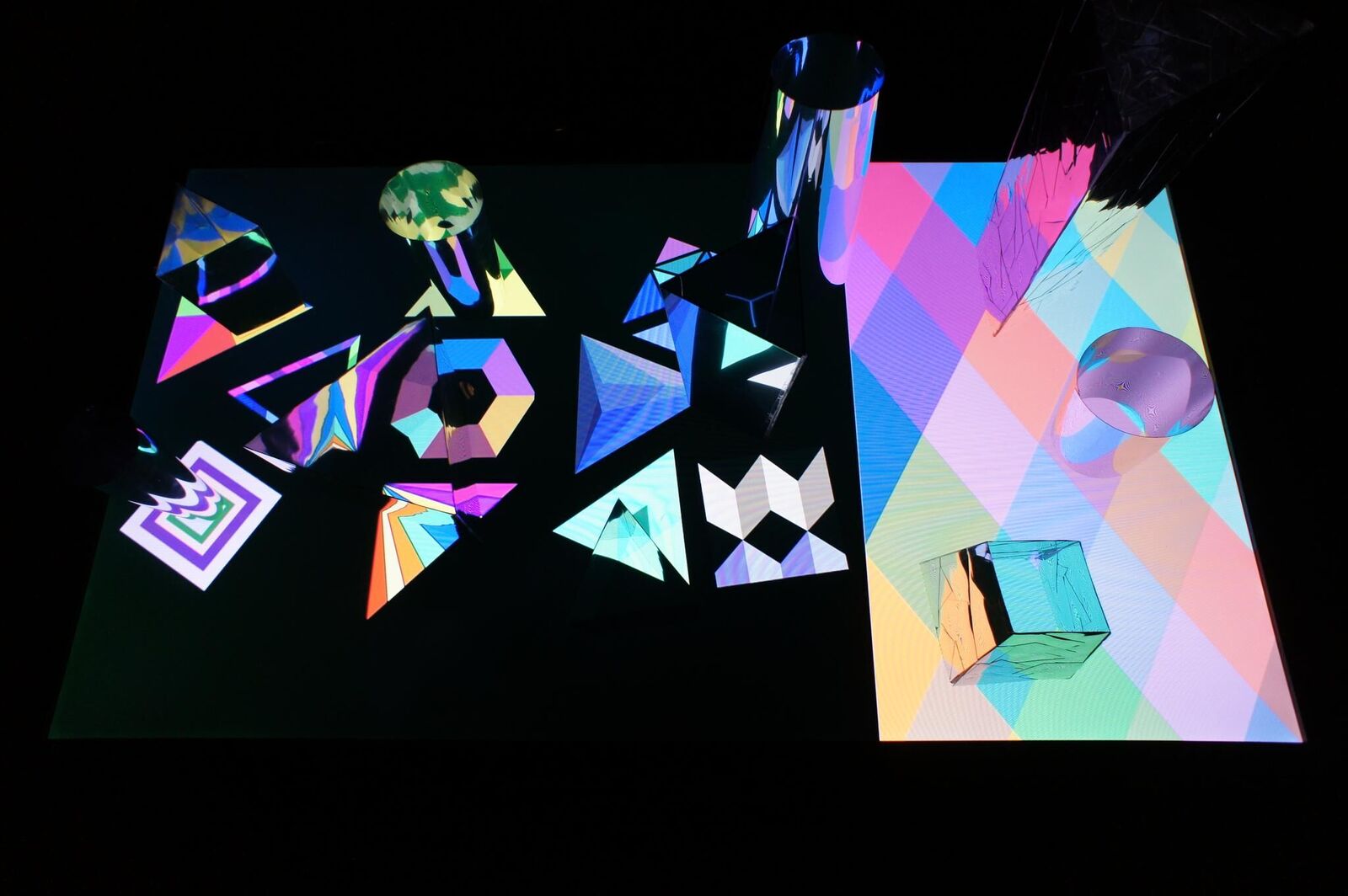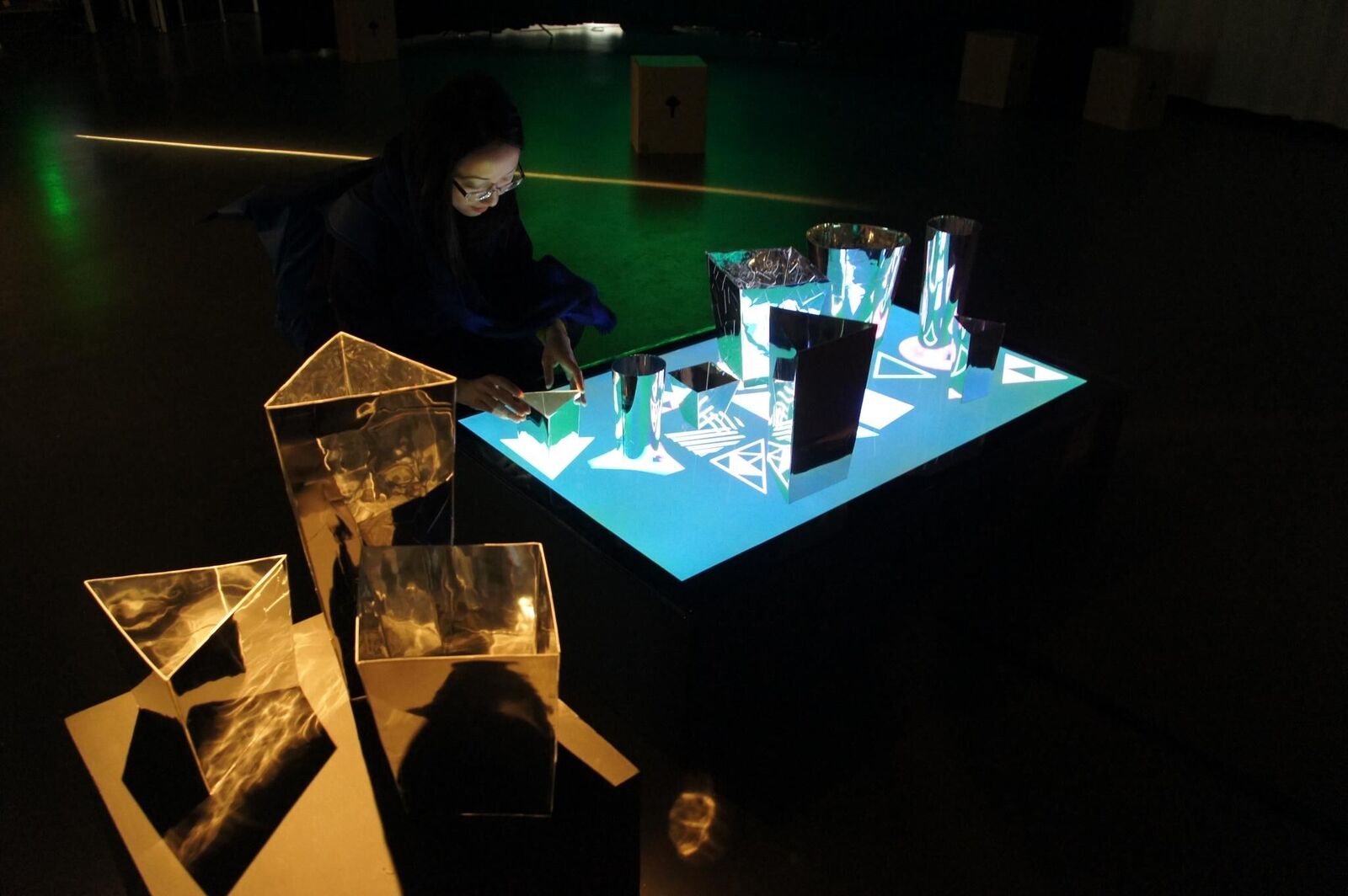 Die grafischen Animationen stehen in Wechselwirkung mit den Spiegelfiguren. Ich habe aus Spiegelfolie die vielen verschiedenen Spiegelfiguren gemacht. Dann wurden die Spiegelfiguren auf einer grafischen Animation installiert. Diese Animation hat verschiedene bewegliche Effekte. Durch den Spiegel kann der Betrachter diese beweglichen reflektiven Effekte schauen. Die Betrachter können die Spiegelfiguren selbst arrangieren. So kann der Betrachter durch Benutzung dieser beiden Elemente ein neues Bild / eine neue Betrachtungsweise erschaffen.
