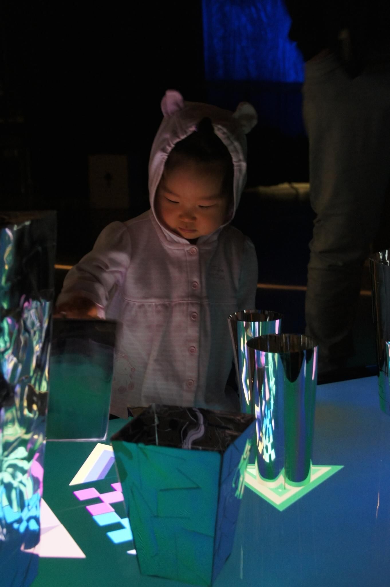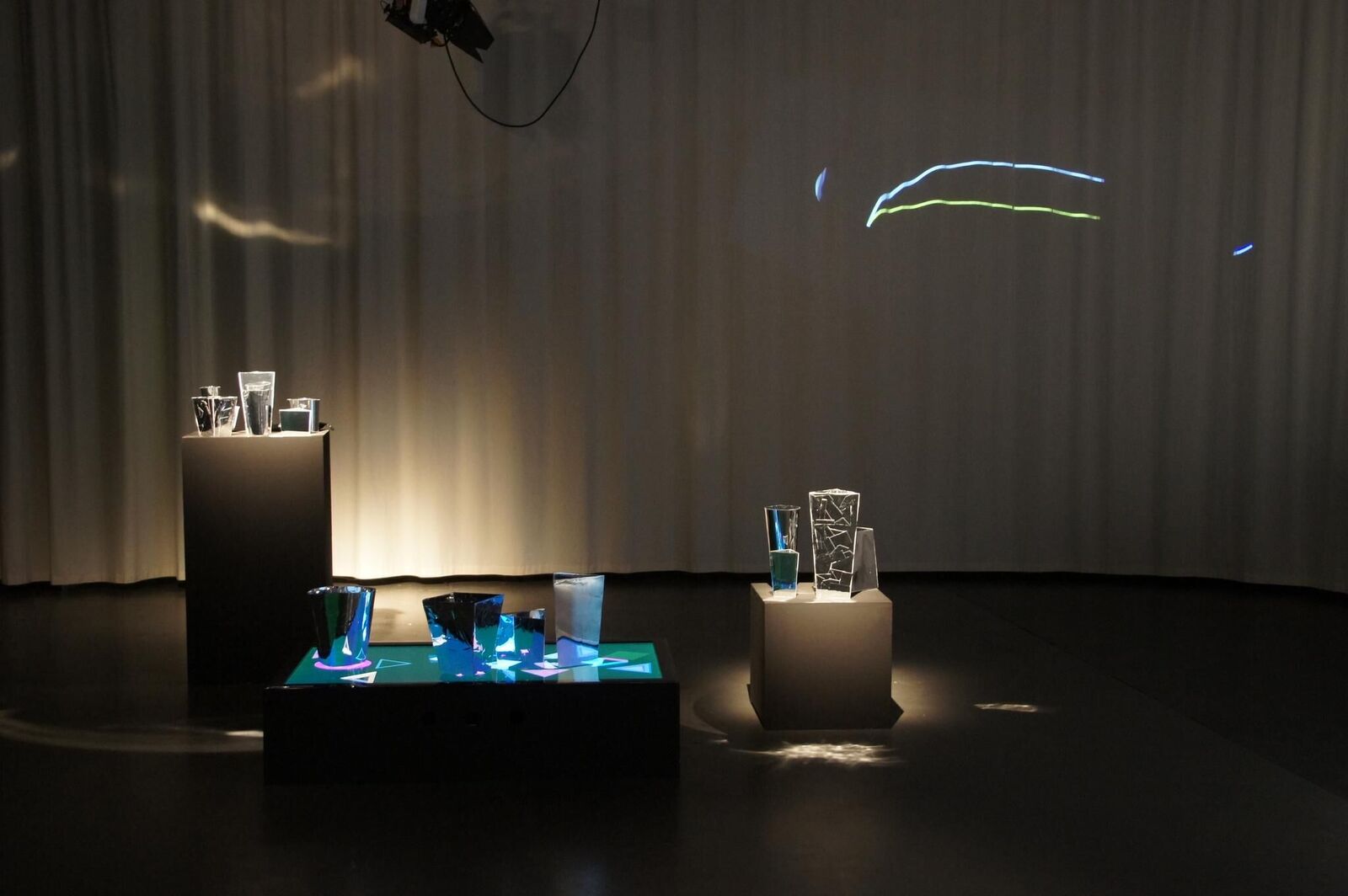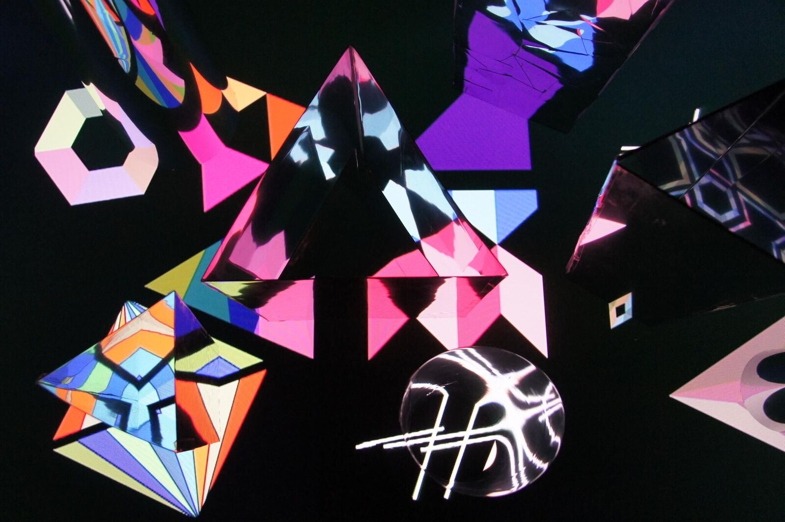 Die grafischen Animationen stehen in Wechselwirkung mit den Spiegelfiguren. Ich habe aus Spiegelfolie die vielen verschiedenen Spiegelfiguren gemacht. Dann wurden die Spiegelfiguren auf einer grafischen Animation installiert. Diese Animation hat verschiedene bewegliche Effekte. Durch den Spiegel kann der Betrachter diese beweglichen reflektiven Effekte schauen. Die Betrachter können die Spiegelfiguren selbst arrangieren. So kann der Betrachter durch Benutzung dieser beiden Elemente ein neues Bild / eine neue Betrachtungsweise erschaffen.