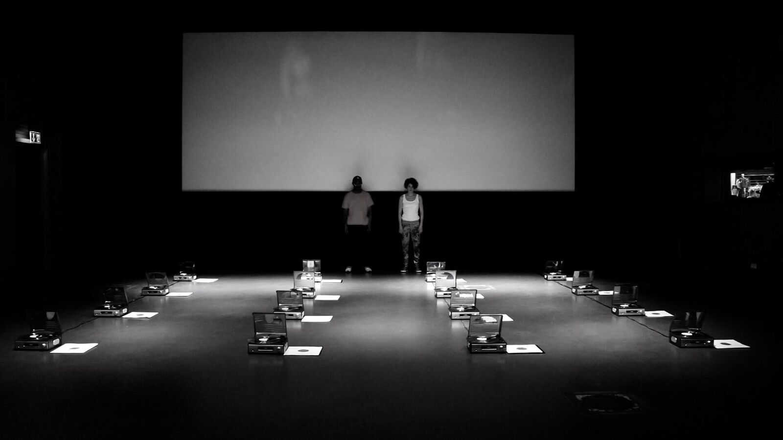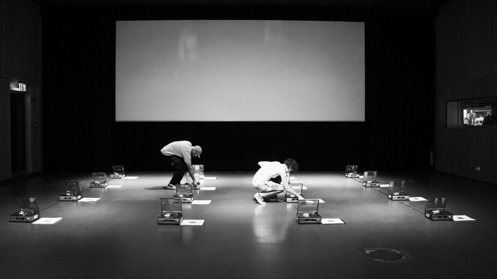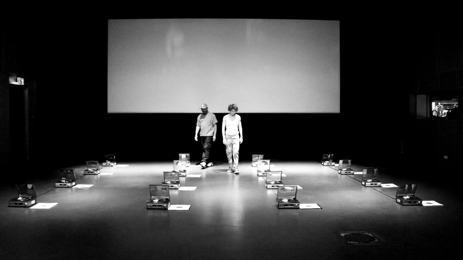 In pasdedeuX, 16 identical turntables with built-in amplifier and loudspeaker are arranged as a square 4x4 cluster on the floor. At each turntable leans a transparent LP in a white envelope. Each LP has been recorded with an eight-minute individual speech- and sound composition. 2 performers enter the field. Slowly and in succession, they start playing the LPs and operating the turntables. They move, communicating quietly, listening to each other through the turntable field, watching the other's actions, pausing, moving again and reacting 'musically'. From the beginning, the audience becomes the observer of a laboratory that does not become aware of this observation at any moment. Text fragments are spoken, addressed to the space, sometimes turned to the partner while operating a device. One communicates references and puts on ones own voice from LP. A dialogue can arise. What was originally marketed and postulated as progress led instantaneously to a creeping sense of loss, which helped to put the supposedly outdated in another state of perception allowing it to be questioned in a different way. The swiftly accumulated media scrap turned into another instrument. Playing records and the altered, partly aggressive handling of obsolete media technology leads to a performative recoding of the meanwhile historic string of signs. Every switch, every move, every content, even the context of use becomes tangible and can be re-combined and transposed into the now