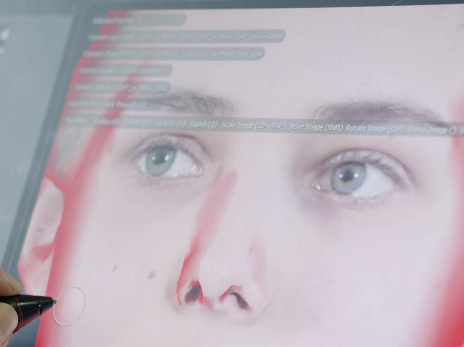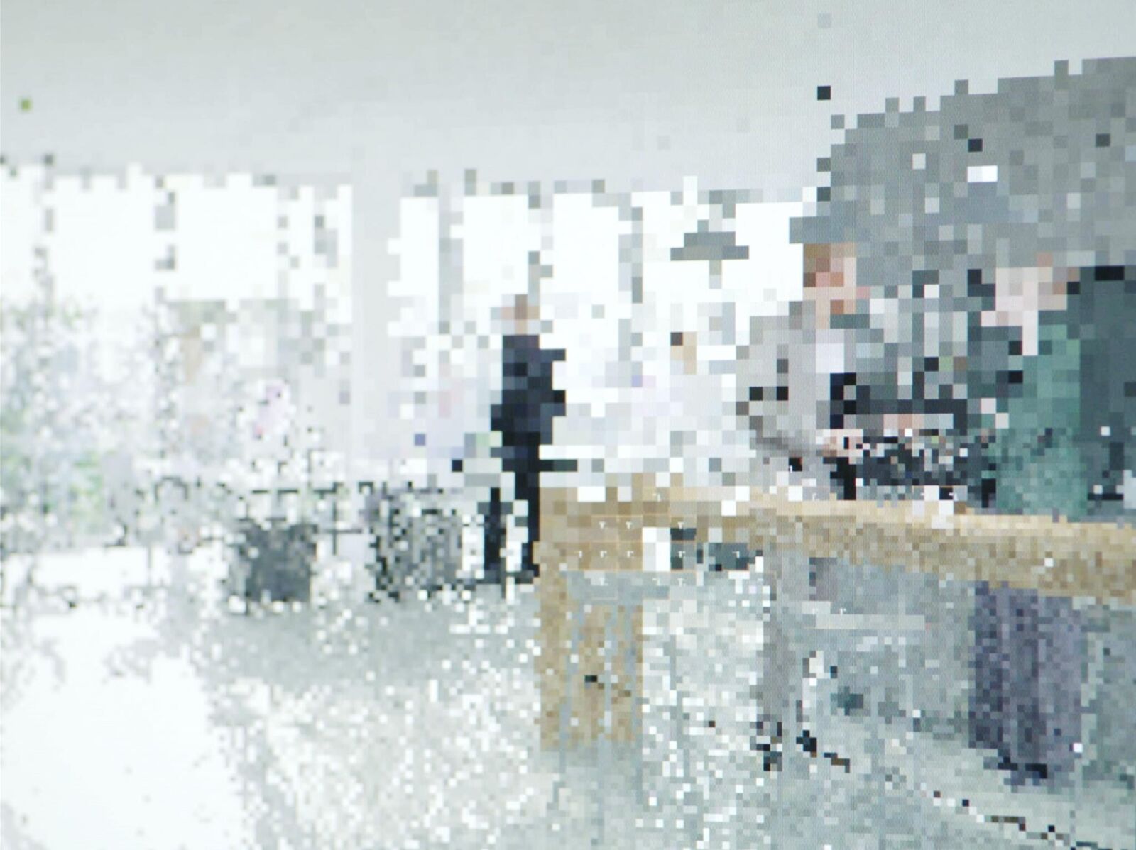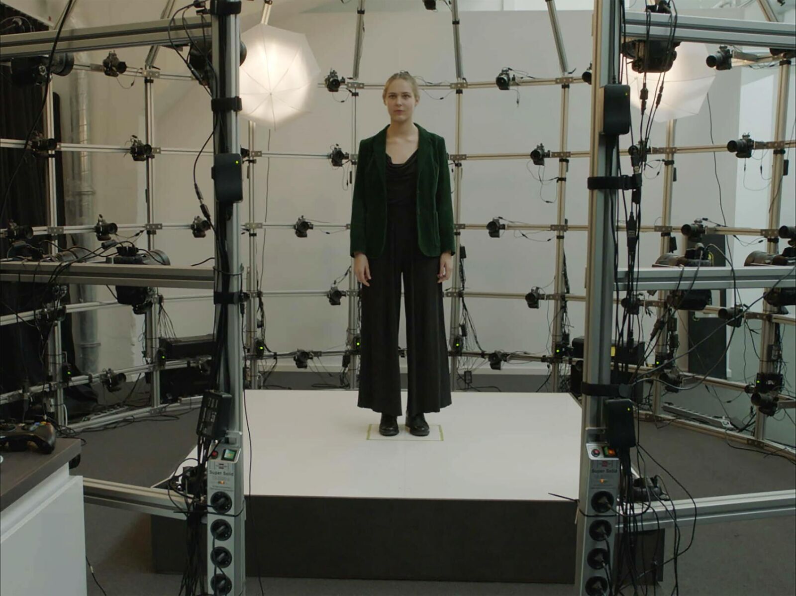 ""Auftritt und Abgang von Mascha B."" begleitet eine junge Frau durch einen digitalen Übersetzungsprozess. In den Räumlichkeiten einer großen Architekturvisualisierungsfirma entsteht in minutiösen Arbeitsabläufen ein Werbebild: Mascha B. wird 3D-gescannt, digital weiterverarbeitet und retuschiert. Ein virtueller Büroraum wird möbliert und ausstaffiert und anschließend mit Mascha B. und digitalen Kolleg*innen belebt. Das Rauschen der Rechner und Scanner gibt den Grundton an. Der Film endet mit einer finalen Mise en Scène.