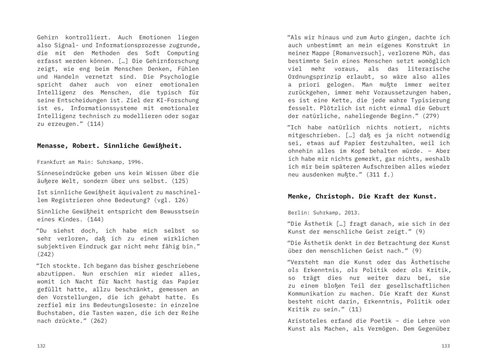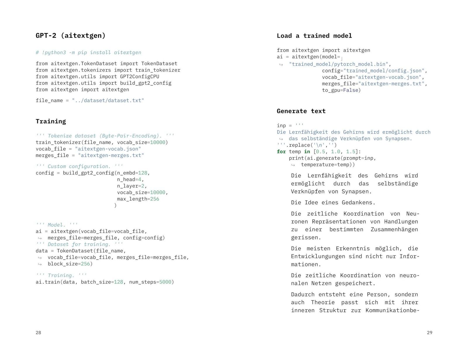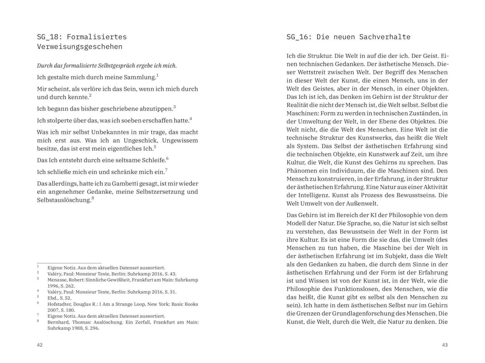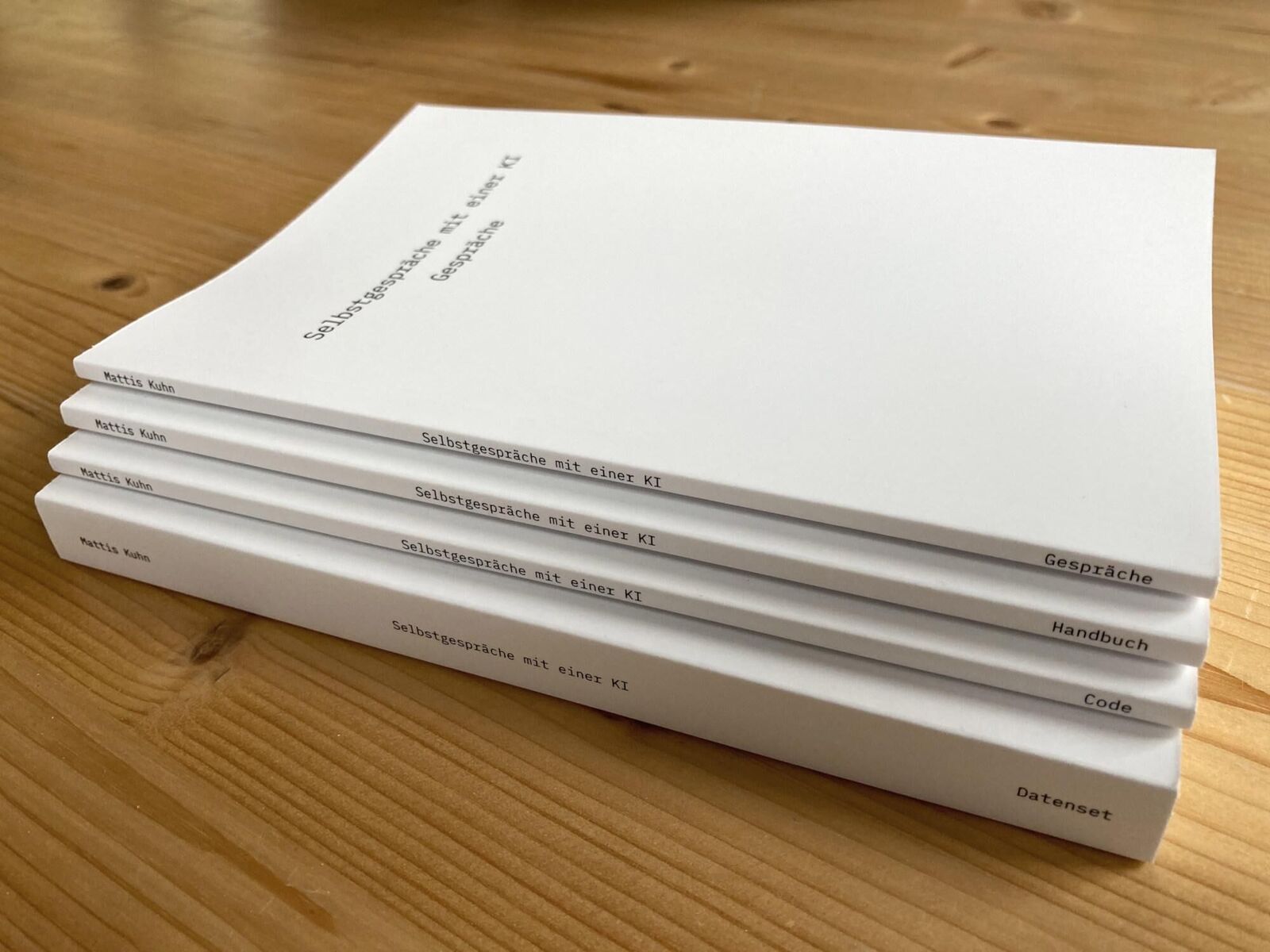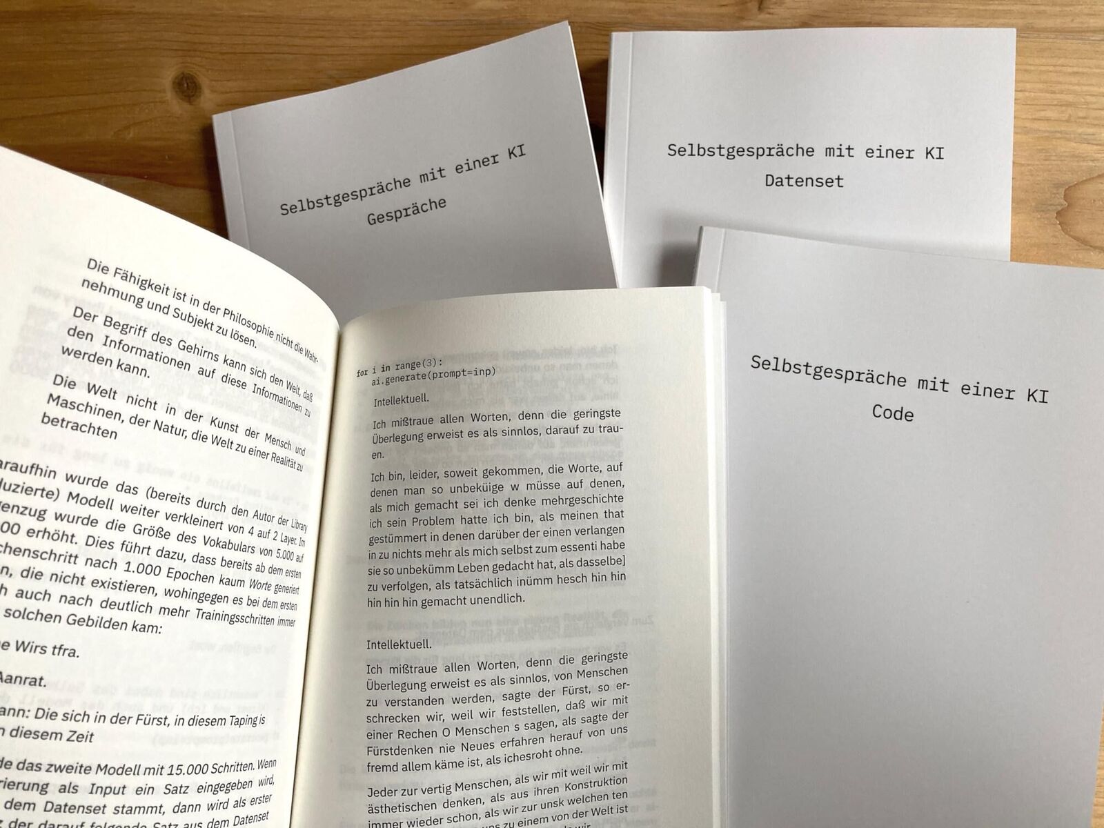 »Selbstgespräche mit einer KI« (Self-talks with an AI) is the construction, use and reflection of an intelligent typewriter, a text generator programmed for my thinking and writing. The AI is trained with manually selected quotations from aesthetics, natural sciences, computer science, philosophy of technology and prose. This writing assistant makes suggestions for the continuation of my thoughts. In the foreground it is about a machine writing aid for literature or theory. In the background, it is about a machine that writes me (my view of the world and myself). Self-definition through self-reflection and self-design, both by means of AI. Through the use of the machine a four-part portrait of the human and machine author is created, which merge with each other: 1) »Selbstgespräche« (self-talks): Texts written jointly by me and the machine. 2) »Datenset« (dataset): The quotations used to train the typewriter. 3) A »Handbuch« (manual) that documents and reflects the process of creation. 4) The »Code«.