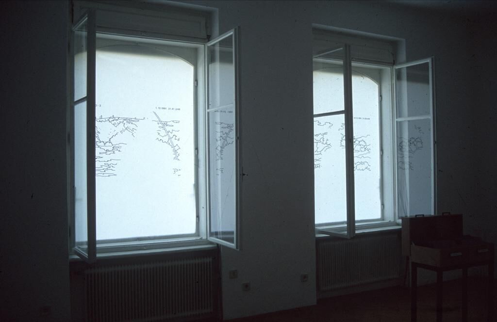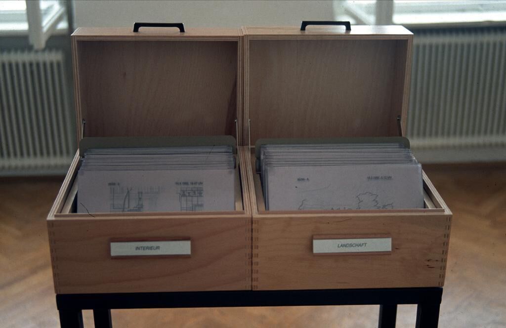 Die Installation “Archives” ist ein Modell für eine Bildspeicherung, eine Hypothese über Bilderkennung und Bildanalyse. Untersuchungsmaterial sind unzählige, aufgezeichnete Medienbilder von Interviewsituationen der täglichen TV-Berichterstattung. Die Bilder wurden zu inhaltlichen Gruppen zusammen gefasst, wobei nur die Ausprägung des Hintergrundes die Klassifizierung bestimmte. Daraus ergaben sich zwei Übergruppen, die mit Landschaft und Innenraum bezeichnet wurden, und jeweils fünf Untergruppen, die sich nach den Bildinhalten bestimmen ließen. Durch die elektronische Bildbearbeitung wurden die TV-Bilder auf ihren formalen Gehalt reduziert - alles, was sich über Farbe, Material, Bewegung, Beleuchtung vermittelt, wurde entfernt. Daraufhin wurden sie mit dem Sendezeitpunkt als Dateiname codiert und archiviert. In der Installation beinhalten zwei Karteikästen die Computeraufzeichnungen, die in die zwei Hauptgruppen untergliedert sind. Zwei Landschaftsmotive wurden vergrößert und in die Fenster - die als Kontaktstelle zur Natur fungierten - eingesetzt. Zwei Wandzeichnungen repräsentierten die Medienbilder der Innenräume.