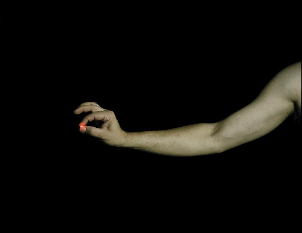 Die Arbeit ist eine Kombination aus Videoprojektion und einem Laserstrahl. Sie versucht die körperliche Erfahrbarkeit des Immateriellen darzustellen. Ein Arm bzw. eine Hand, mittels Video projeziert, versucht ununterbrochen, einen auf dieses Videobild gerichteten Laserlichtpunkt zu fassen, zu berühren. Vorsichtig, langsam, fast ängstlich nähert sich die Hand diesem rotem Punkt. Auf der Projektionsfläche entsteht ein gespanntes und dennoch ruhiges, gleichzeitig sinnloses ""Berührungsspiel"", gleich einem unlösbarem Problem. Mittels der Technik zeigt sich dem Betrachter das digitale Bild einer körperlichen Erfahrung.