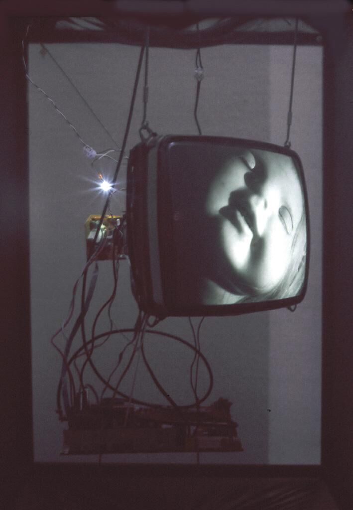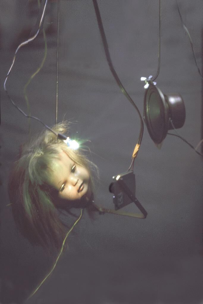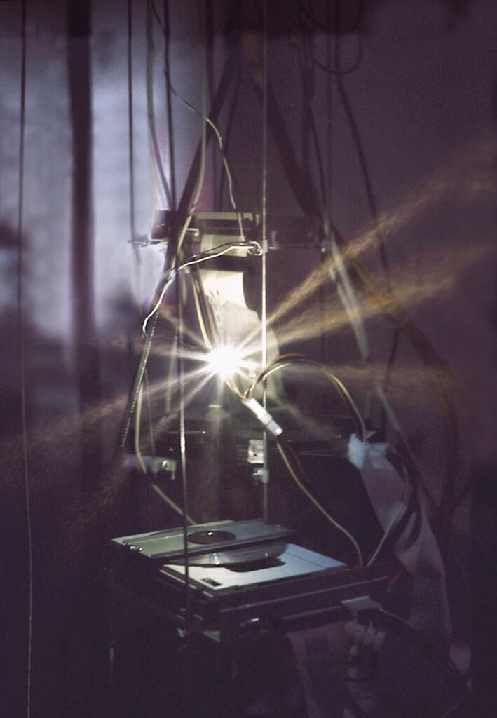 Sieben Container aus halbtransparentem, schwarzem Stoff mit folgendem Inhalt: Nr.1: Wesentliche Bauteile eines Computers (in Funktion), CD-Player (Dvorák, 9. Sinfonie „Aus der neuen Welt“), Lautsprecher. Nr.2: Puppenkopf mit elektrisch gesteuerter Augenbewegung, darauf gerichtete Miniaturvideokamera. Nr.3: Gehäuseloser Videobildschirm. Nr.4: Gehäuseloser Computerbildschirm. Nr.5: „Discokugel“ mit elektrischem Antrieb. Nr.6: Wesentliche Bauteile eines Nadeldruckers. Nr.7: Transformatoren und Netzgeräte zur Stromversorgung. Jeder Behälter wird durch eine kleine, blaue Glühlampe von Innen erhellt. Ein Programm generiert per Zufall eine Ereignisliste für die angeschlossenen „Peripheriegeräte“ des Computers: Start- und Stopzeitpunkt für die Dvorák-Sinfonie (abgespielt wird immer wieder von neuem der Beginn des Largos, das nach einiger Zeit unvermittelt abbricht). Öffnen und Schließen der Puppenaugen. Start einer digitalisierten Videosequenz von der Computerfestplatte (Countdown und fehlgeschlagener Start einer amerikanischen Trägerrakete im Jahr 1960; Der Flugkörper explodiert kurz nach dem Abheben). Ist die Szene zu Ende, zeigt der Bildschirm das Videobild des Puppenkopfes. Zeitweiser Antrieb der „Discokugel“ durch den Elektromotor, bis sie allmählich wieder zur Ruhe kommt. Der Rechner gibt die einzelnen Steuerbefehle auf Endlospapier über den Nadeldrucker aus, dessen schrilles Arbeitsgeräusch zusammen mit dem Dvorák-Largo das absurde Geschehen akustisch unterstreicht.