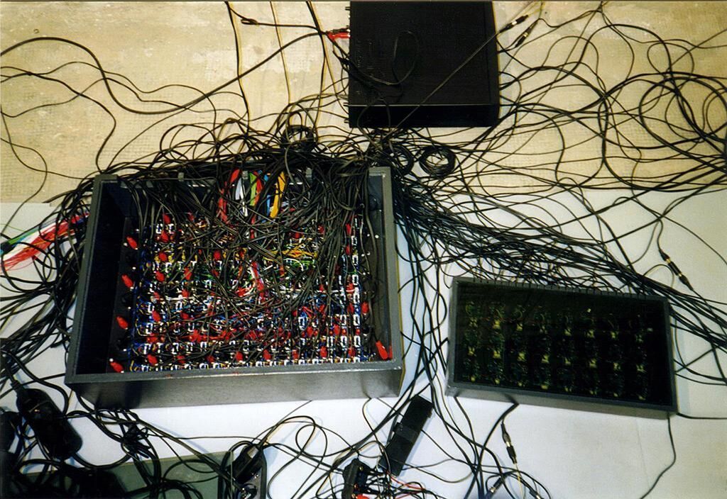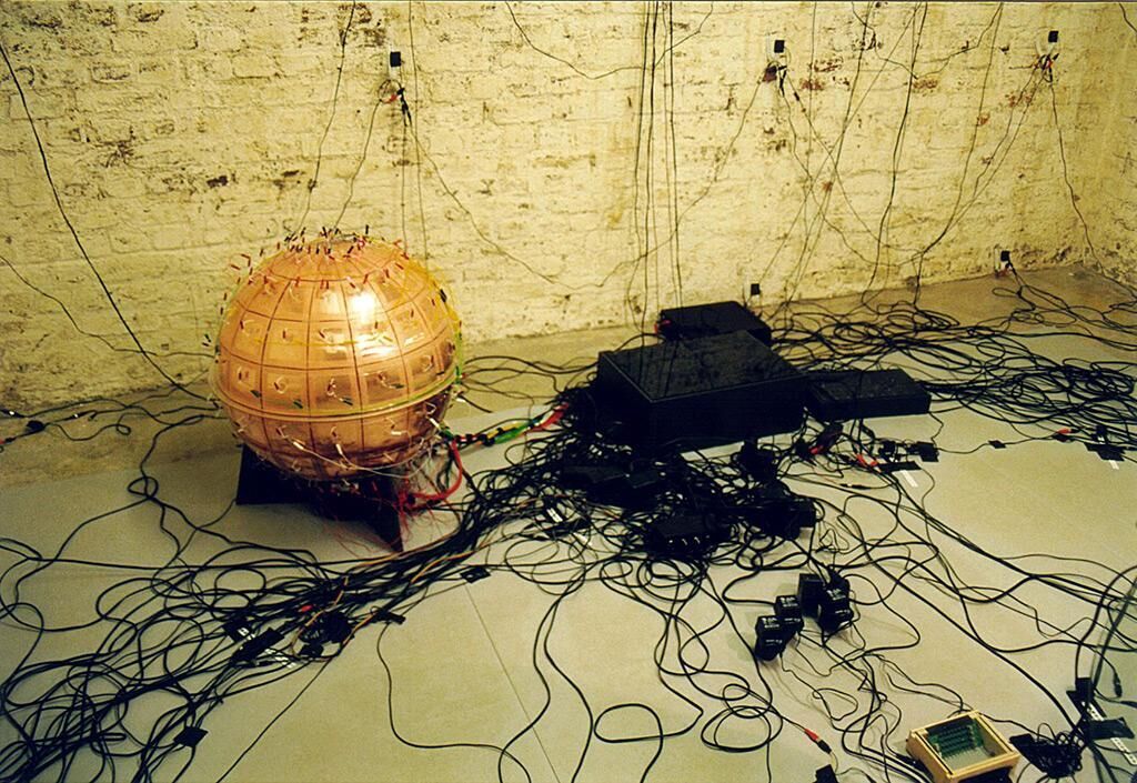 Die Idee des Simulations-Simulator ist, die Arbeitsweise einer 3D-Computer-Simulation in der Wirklichkeit nachzubauen. In einem Raum sind 128 kleine Videokameras gleichmäßig verteilt, an Wänden, Decke und Boden. Blickrichtung jeder Kamera geht zu einem Tisch mit Monitor und Joystick in der Mitte des Raumes. Setzt der Besucher sich an den Tisch, erscheint auf dem Monitor sein eigenes Abbild. Mit dem Joystick steuert er die Blickrichtung auf sich selbst: seitlich, nach oben und unten und diagonal kann er sich umfliegen. Der Wechsel zwischen den Perspektiven erfolgt in kleinen Stufen, durch kurze Bildzusam¬menbrüche und Störungen zeitlich umrahmt. Jede Blickrichtung wird begleitet von einem Klang, zusammengesetzt aus je 2 einzelnen Tönen: 1 aus 8 für die horizontale, 1 aus 16 für die vertikale Posi¬tion im Raum. Aus 24 Einzeltönen bildet sich so zu jeder der 128 Blickrichtungen ge¬nau ein charakteristischer Klang. Von Zeit zu Zeit gibt es irritierende Momente, die aus der Realzeit hinausführen: der Monitor zeigt frühere Akteure am selben Ort. Aspekte simulierter Welten verschmelzen mit denen der „unvermittelten“ Wirklichkeit in der realen, konkreten Situation des Betrachters/Akteurs. In philosophischer Weise geht es um Fragen zur Definition von Beobachter und Beobachtetem, Subjekt und Objekt, und um deren Synthese. Denn der Akteur im Simulations-Simulator ist beides: handelndes Subjekt, und gleichzeitig, aus 128 wählbaren Perspektiven, der Mittelpunkt seiner eigenen Beobachtung.