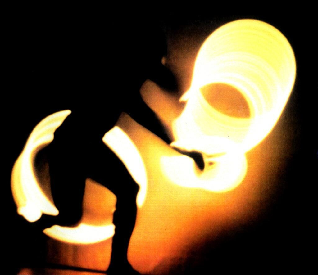 The language and instrumentation of ""Light Dance"" (laser, holography, optical costumes and sub-spaces) have blossomed into 3D space-defining light phenomena reportedly more real than virtual reality. ""Light Dance"" is a transposition of the dance from matter to light, its locus at the body, its reach as far as the confines of the room. The choreographed synthesis of body movement, architecture and light creates a realm of silence, of beginnings, boundlessness, pure possibilities and zero, and a dramaturgy of space: point, line, plane, and volume in transformation within the defining limits of pure light, darkness, colour and the human shape.