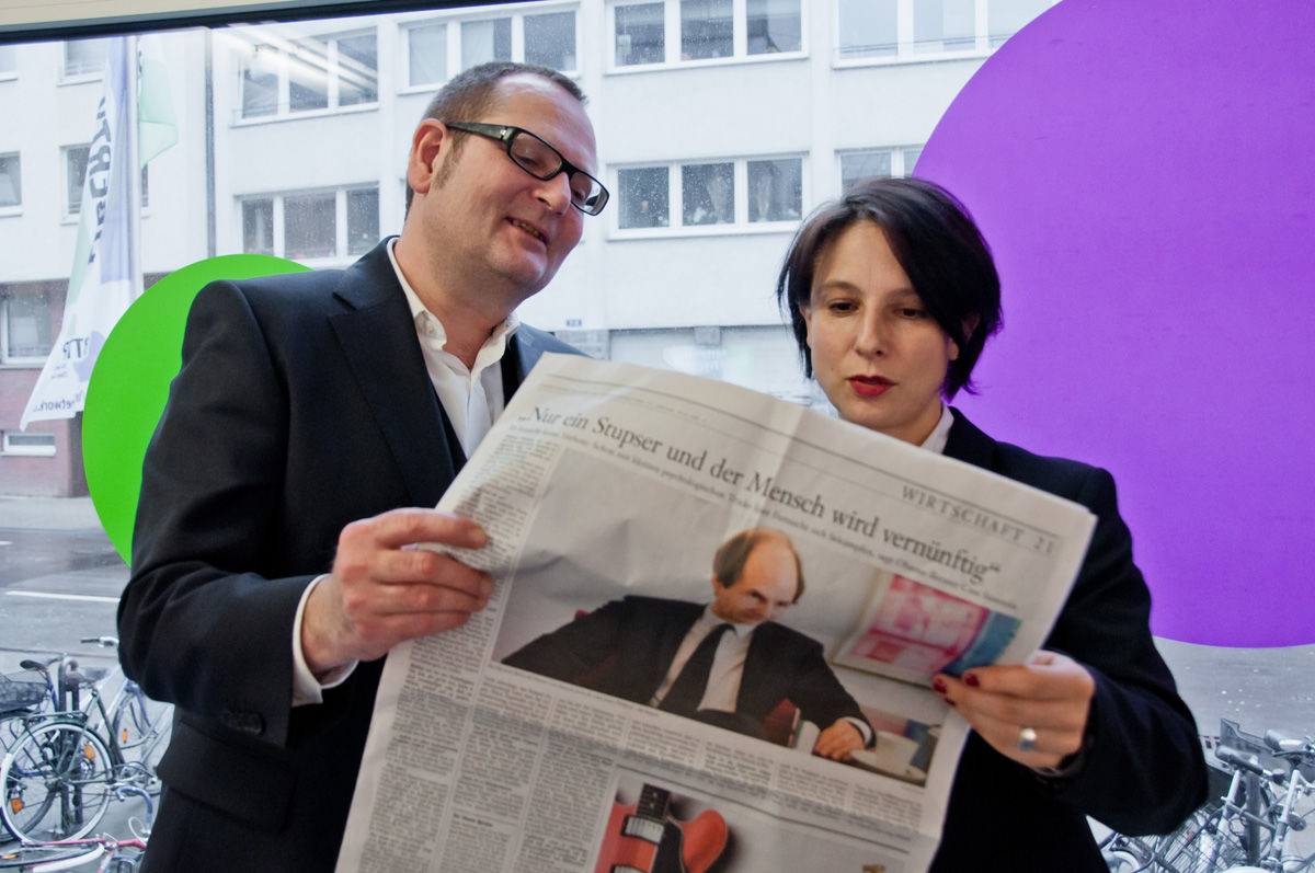 Vom 29. Januar bis 24. Februar 2013 ist The Better Think Tank Project (BTTP) mit ihrem Projekt „Liberty Café“ zu Gast in Glasmoog – Ausstellungsraum der Kunsthochschule für Medien Köln. „Liberty Café“ ist ein performatives Ausstellungsformat und bietet vom 29. Januar bis 2. Februar, täglich ab 11 Uhr, ein öffentliches Forum für die Wissens- und Ideenproduktion, sowie ab 18 Uhr Expertenrunden zu wechselnden Themen. Eingeladen sind u.a. der Rechtsanwalt und Aktivist Detlef Hartmann, der Philosoph und Politikwissenschaftler Michael Hirsch, der Medienwissenschaftler Rupert Gaderer sowie der Politikwissenschaftler Ulrich Müller von LobbyControl. Die Ausstellung mit Videodokumentationen zum "Liberty Café" sowie früheren BTTP-Veranstaltungen, wie dem „Freedom Dinner“ oder dem „Capitalist Ball“, ist bis 24. Februar zu sehen. Das „Liberty Café“ skizziert die ästhetische Vorgehensweise von Wissensproduzenten, wie z.B. Think Tanks, um sie einer reflexiven Diskussion, die solche Denkfabriken, Denkräume oder Wissensproduzenten grundsätzlich vermeiden, zugänglich zu machen. „Liberty Café“ widmet sich vorrangig der Behebung offensichtlicher Defizite der Think-Tank-Bewegung, wie z.B. ihrer – aus künstlerischem Blickwinkel – grundlegend falschen Themenwahl: der Ökonomisierung aller Lebensverhältnisse, der Erosion demokratischer Prozesse und nicht zuletzt der mangelnden Flexibilität ihres Denkens. „Liberty Café“ affimiert die strengen Rating-Kriterien der Atlas Economic Research Foundation – „Every month, Atlas hosts Liberty Café in its Washington D.C. office. It features speakers who discuss current topics from all over the world and bring together [our] partners and allies to share ideas.“ (http://atlasnetwork.org/events/) – und bringt Kunst, den Genuss des Kaffeetrinkens und die Kultur der intellektuellen Debatte in einem Forum mit Echokammer zusammen. Der gereichte Kaffee ist preisgünstig, die intellektuelle Debatte nicht billig – beides gibt es diesen Winter in Köln bei Glasmoog. Das Projekt ist Teil einer Reihe lokaler, forschungsbasierter Interventionen, mit denen die KünstlerInnen Manuela Unverdorben und Ralf Homann das Phänomen vor allem neoliberaler Think Tanks und ihrer Netzwerke untersuchen. Die Recherchen konzentrieren sich sowohl auf die vordergründigen Tätigkeiten dieser Think Tanks, verstehen sich aber auch als Reflektion über deren „hidden agenda“ mit Blick auf die Ästhetik im Auftreten, ihren kulturellen Einfluss in Form von Wissensproduktion und daraus resultierenden Ökonomisierungen von Lebensbedingungen. BTTP bindet Tatsachen und Fiktives, Sprache, Corporate Design und Ereignisse von auf dem freien Markt existierenden Think Tanks an neue Inhalte, um einen kritischen Umgang mit ihnen zu ermöglichen. Weitere Informationen unter: http://bttp-network.org. BTTP Vorstand: